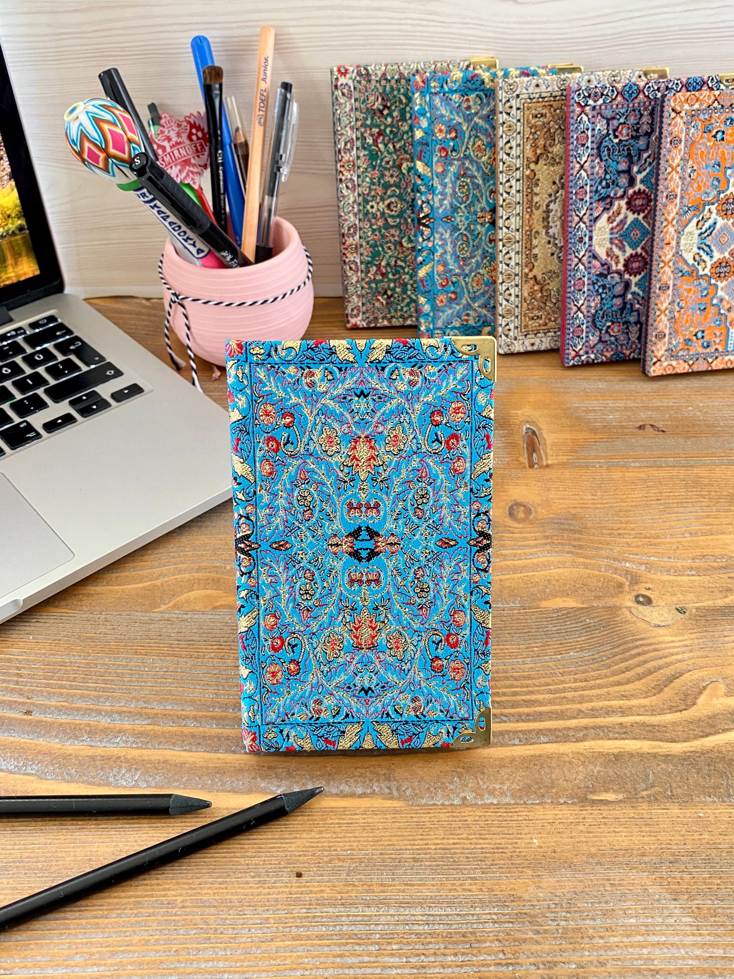 Our bohemian small fabric notebook is perfect for note-takers, travelers and as a pocket journal. You can take it with you for your work and meetings or school. Each notebook is filled with lined pages and has hardcover with Turkish carpet pattern designed brocade fabric on the top with a gold, glittery look and soft and luxurious touch.
