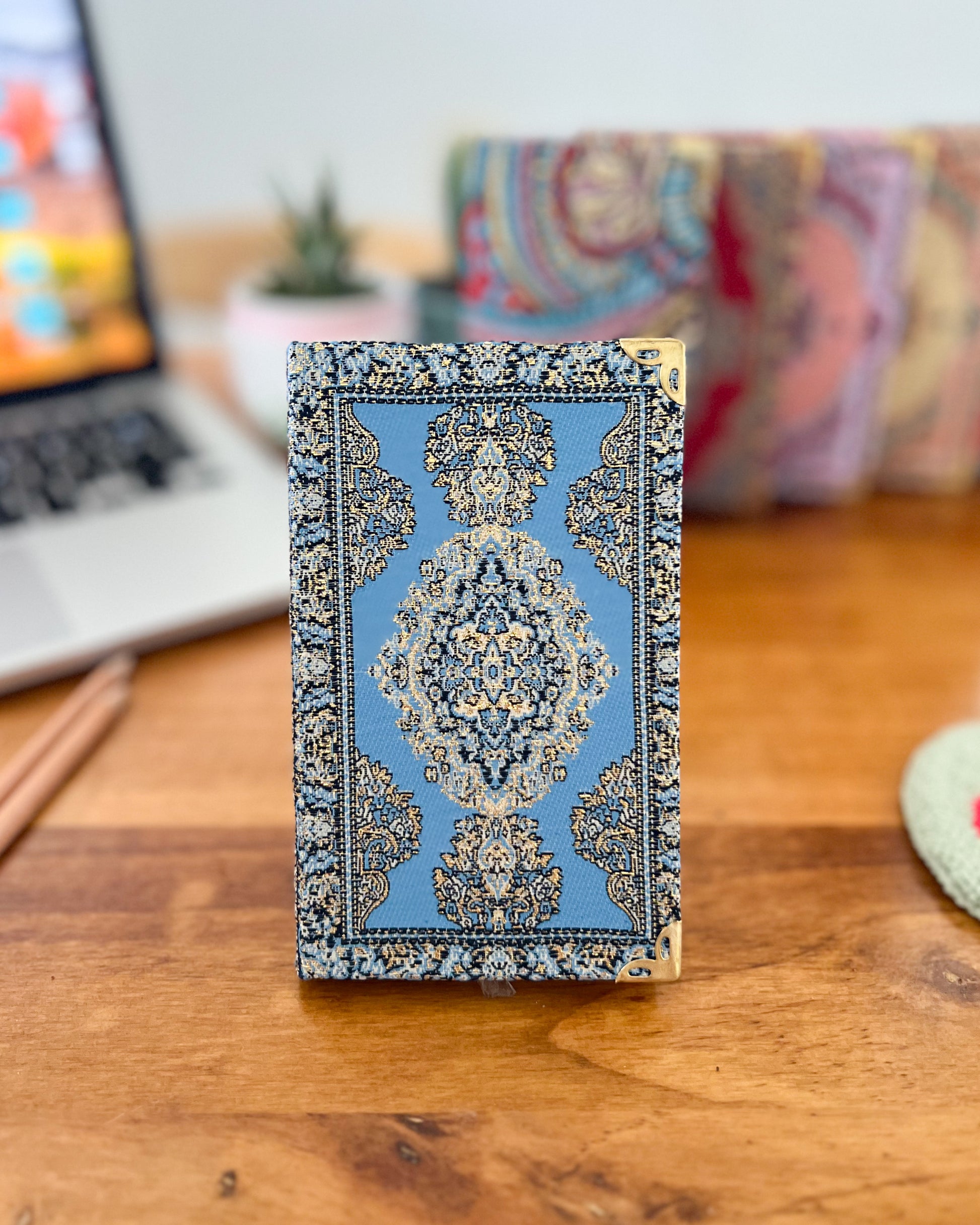 Our bohemian small fabric notebook is perfect for note-takers, travelers and as a pocket journal. You can take it with you for your work and meetings or school. Each notebook is filled with lined pages and has hardcover with Turkish carpet pattern designed brocade fabric on the top with a gold, glittery look and soft and luxurious touch.
