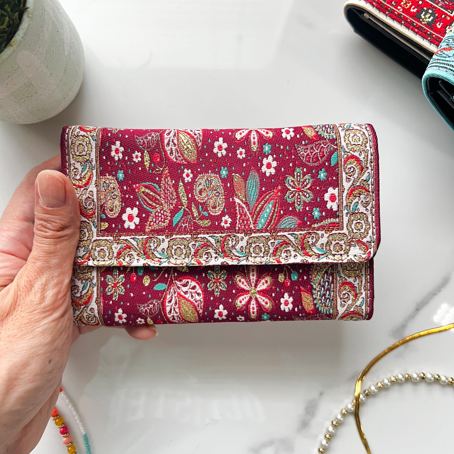 Our Boho wallet is crafted from vegan leather and brocade fabric inspired from Turkish carpet pattern. You will love the soft glimmering gold touch giving these handmade Turkish wallets a luxurious look. The design of the fabric is not a print, it's woven.