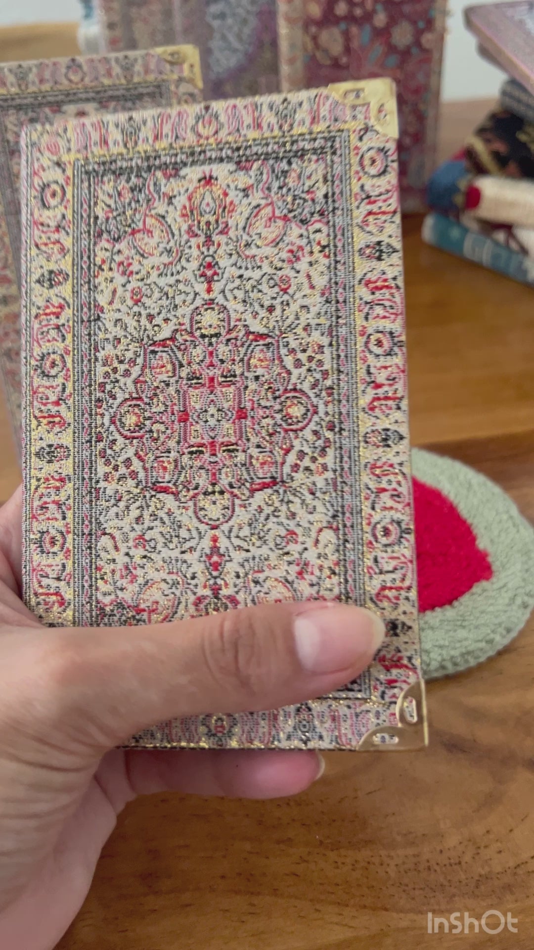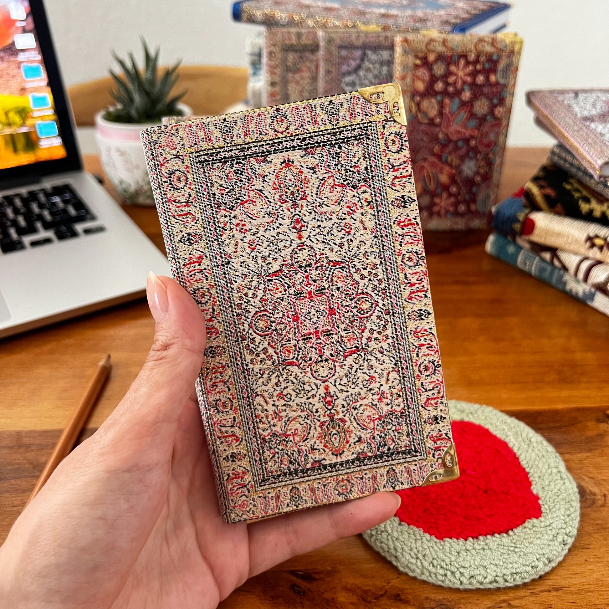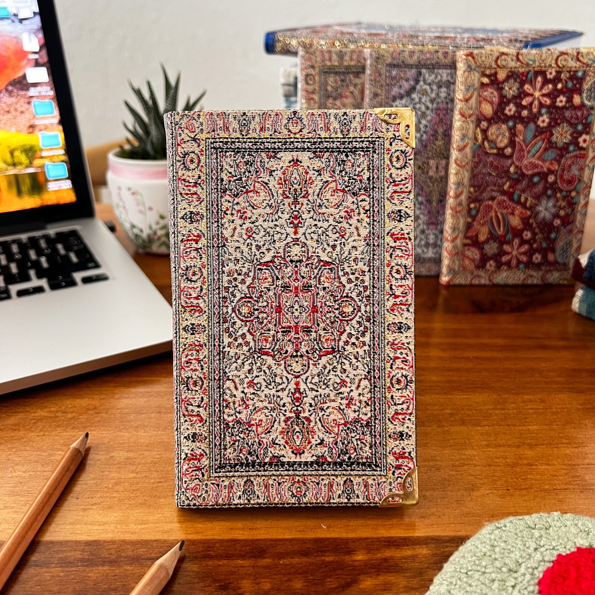 Our bohemian small fabric notebook is perfect for note-takers, travelers and as a pocket journal. You can take it with you for your work and meetings or school. Each notebook is filled with lined pages and has hardcover with Turkish carpet pattern designed brocade fabric on the top with a gold, glittery look and soft and luxurious touch.