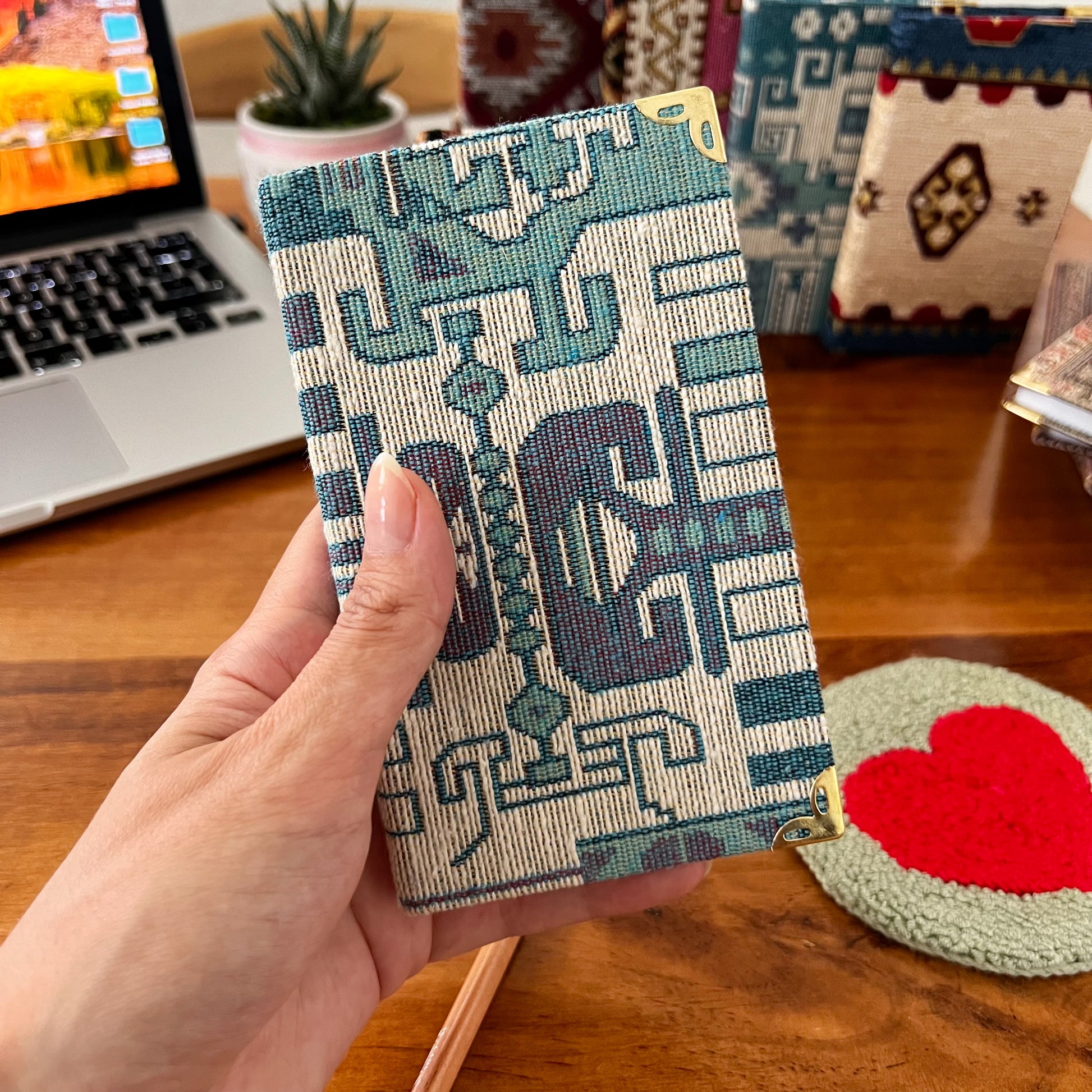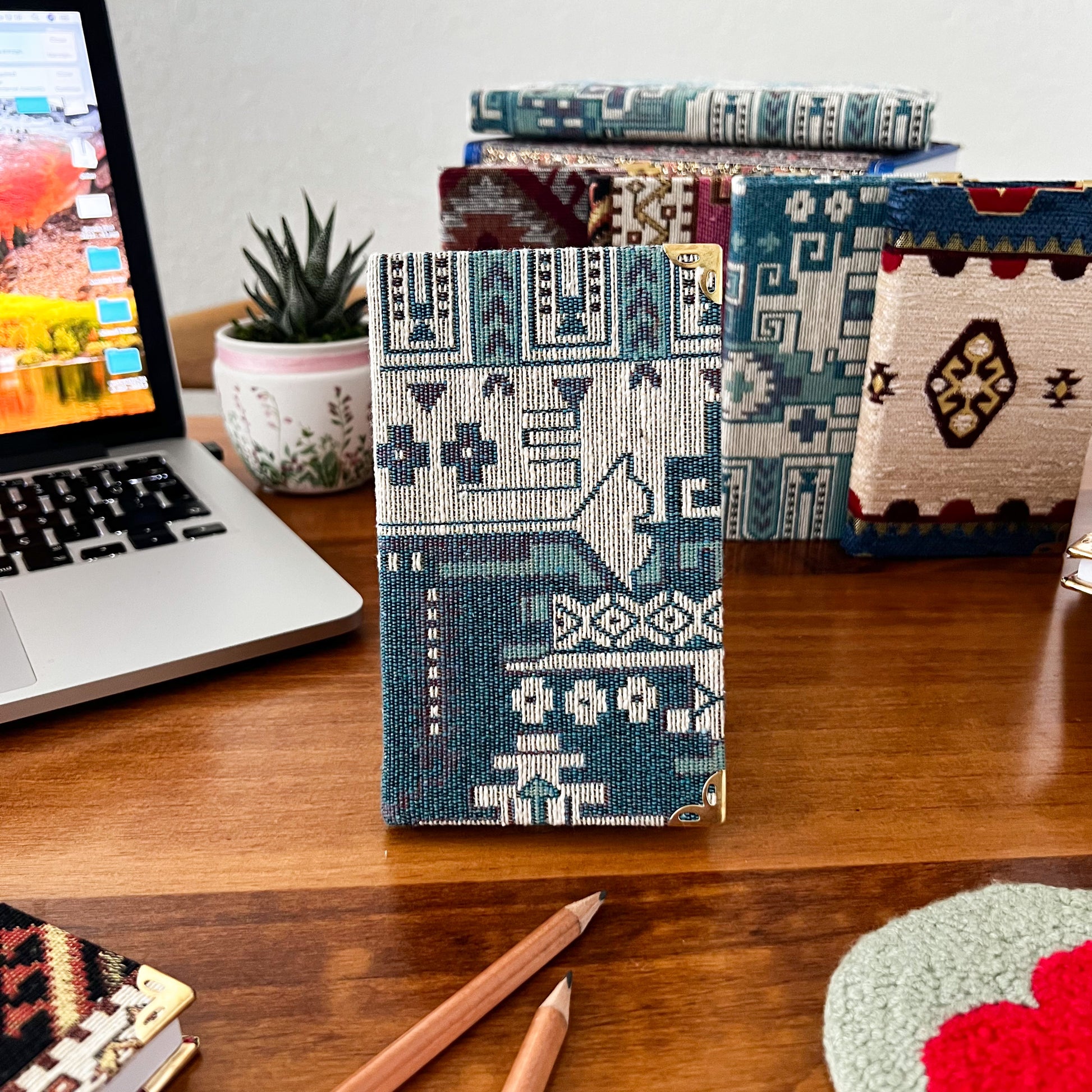 Our bohemian small fabric notebook is perfect for note-takers, travelers and as a pocket journal. You can take it with you for your work and meetings or school. Each notebook is filled with lined pages and has hardcover with Turkish carpet pattern designed woven fabric that is soft and has luxurious touch.