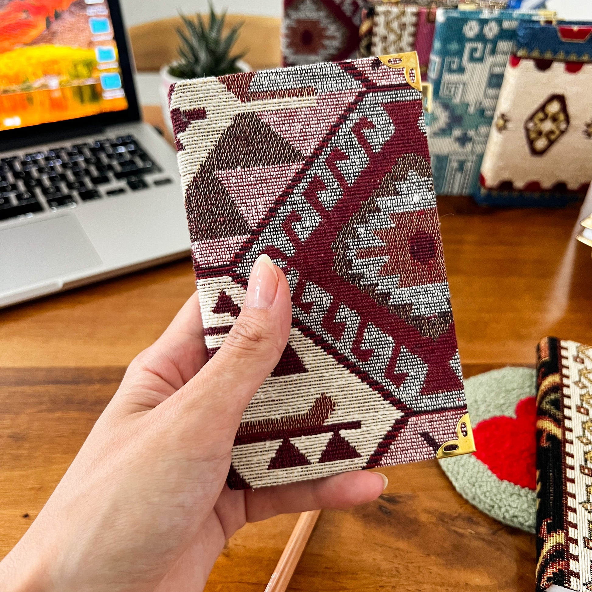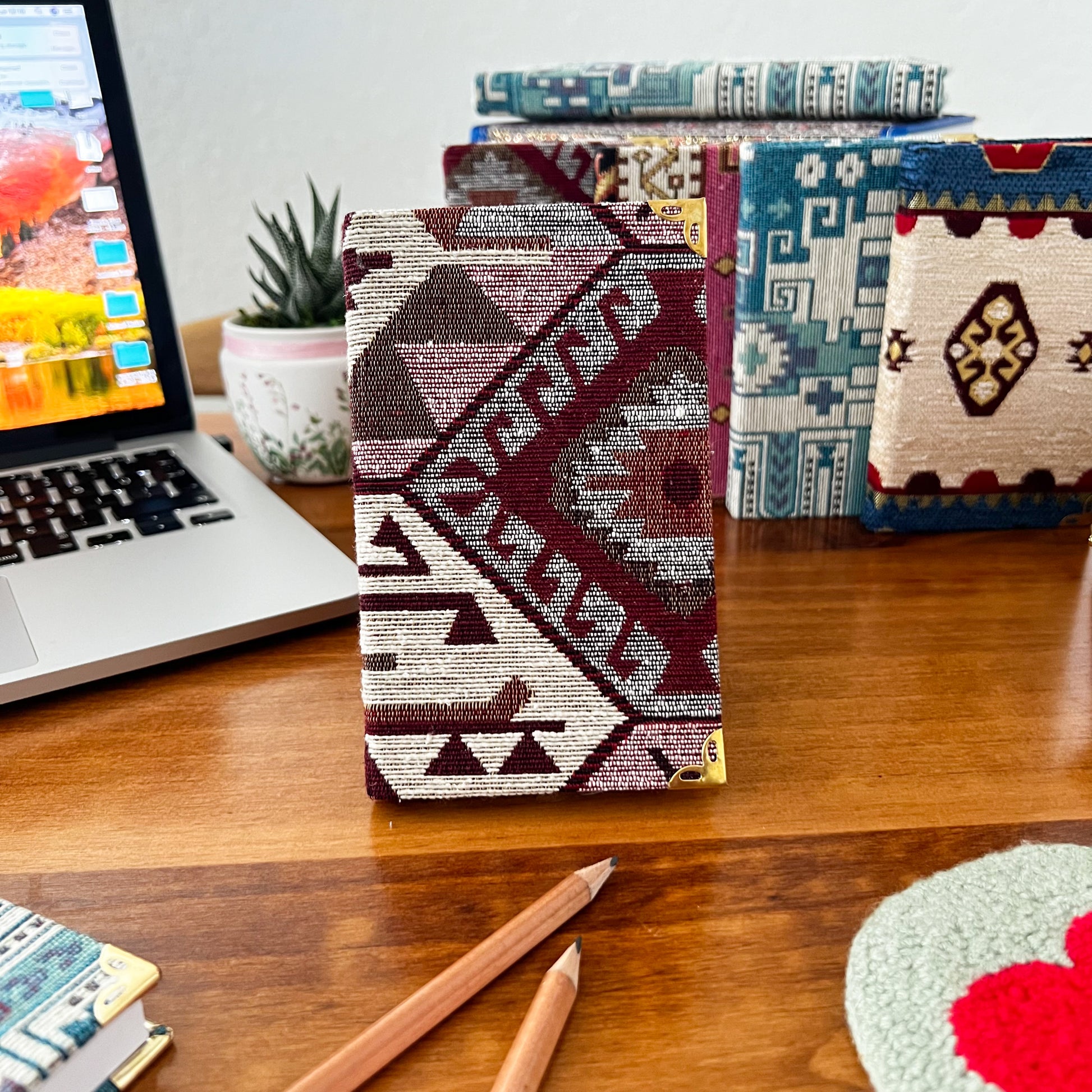 Our bohemian small fabric notebook is perfect for note-takers, travelers and as a pocket journal. You can take it with you for your work and meetings or school. Each notebook is filled with lined pages and has hardcover with Turkish carpet pattern designed woven fabric that is soft.
