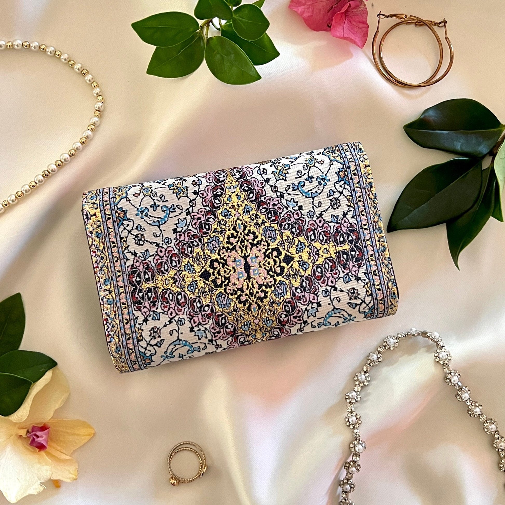 Our Boho wallet is crafted from vegan leather and brocade fabric inspired from Turkish carpet pattern. You will love the soft glimmering gold touch giving these handmade Turkish wallets a luxurious look. The design of the fabric is not a print, it's woven.