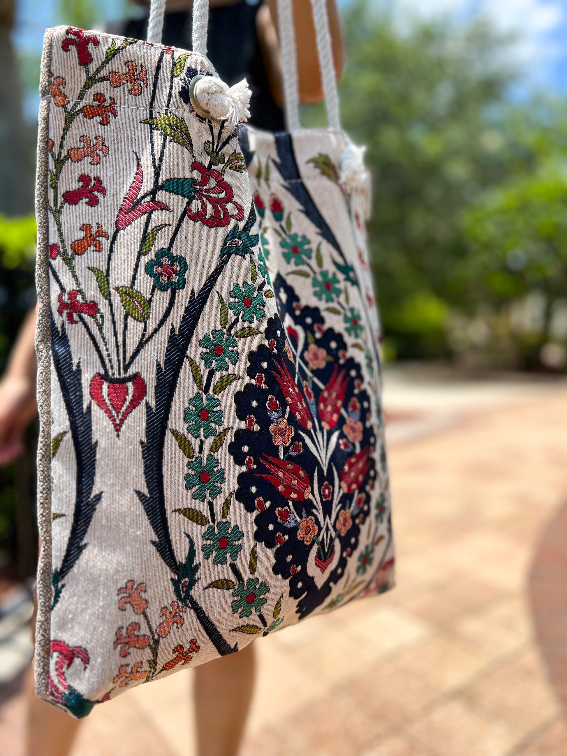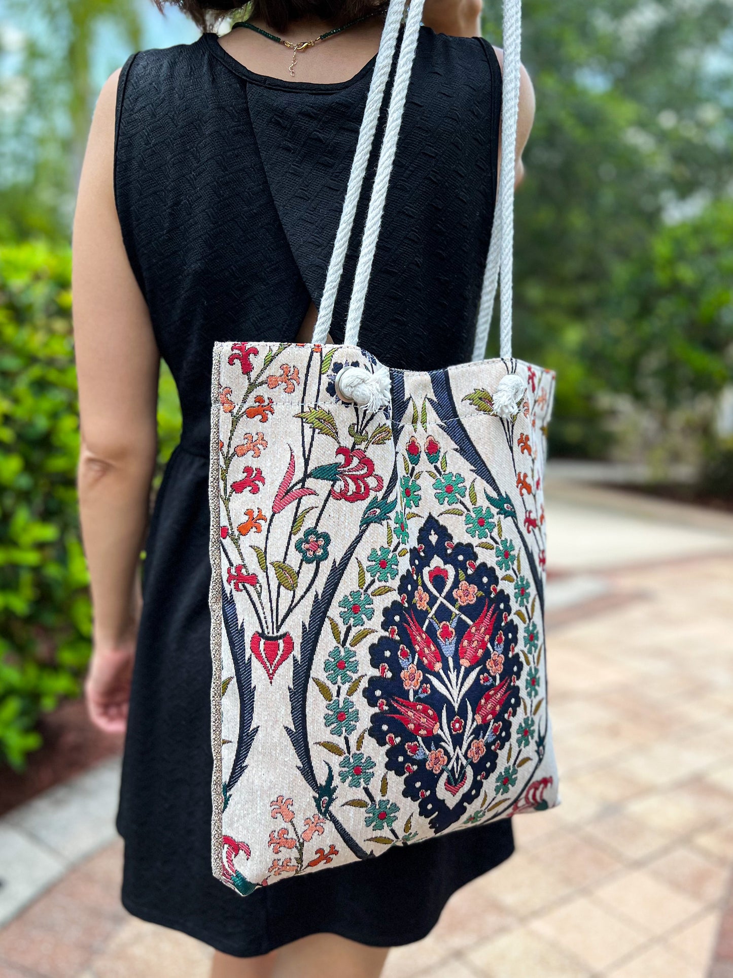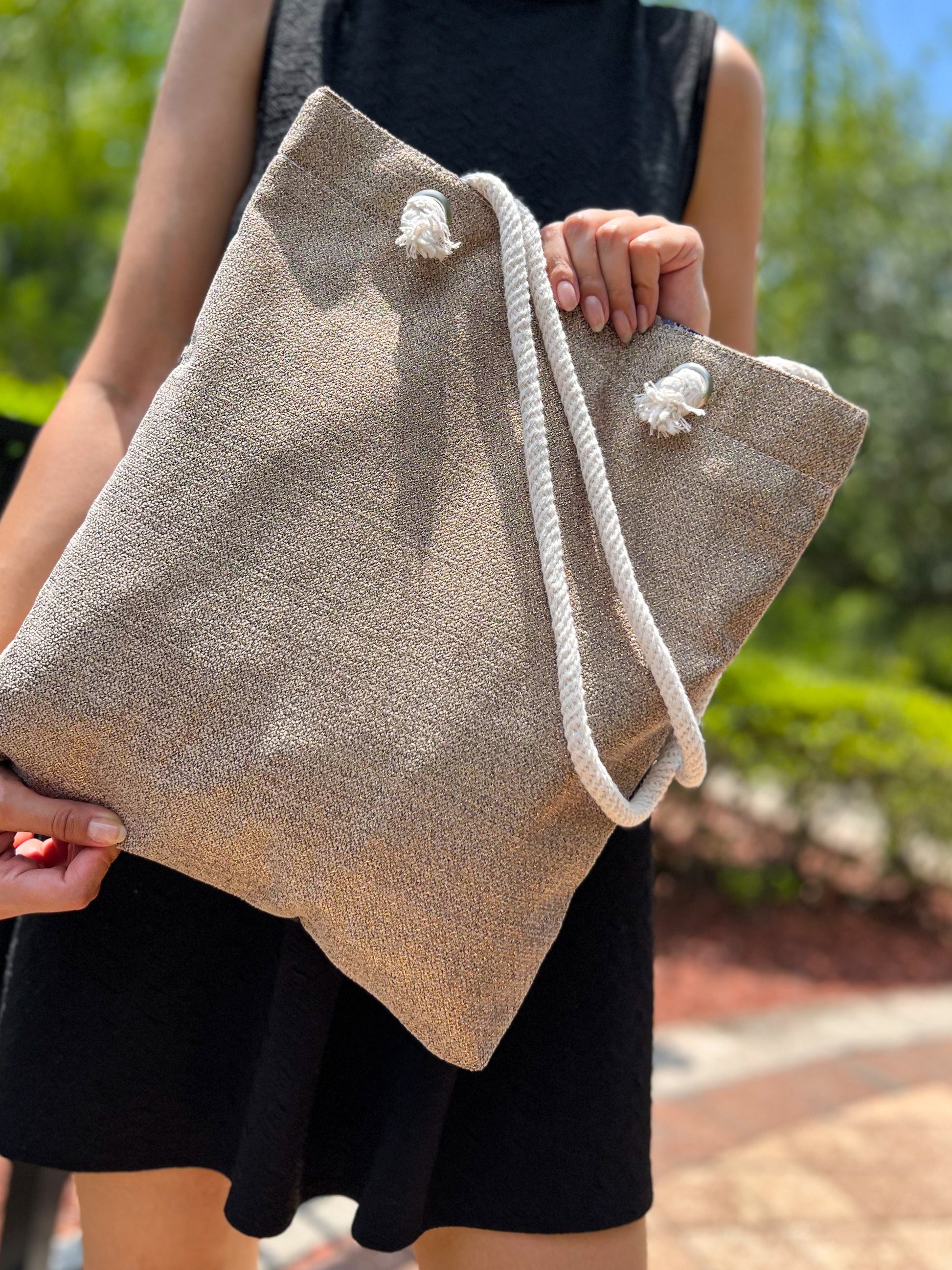 Crafted from premium woven fabric, our tote bag showcases a unique threaded design not printed. Our woven tote bag effortlessly transitions from day to night, complementing any outfit or any occasion.