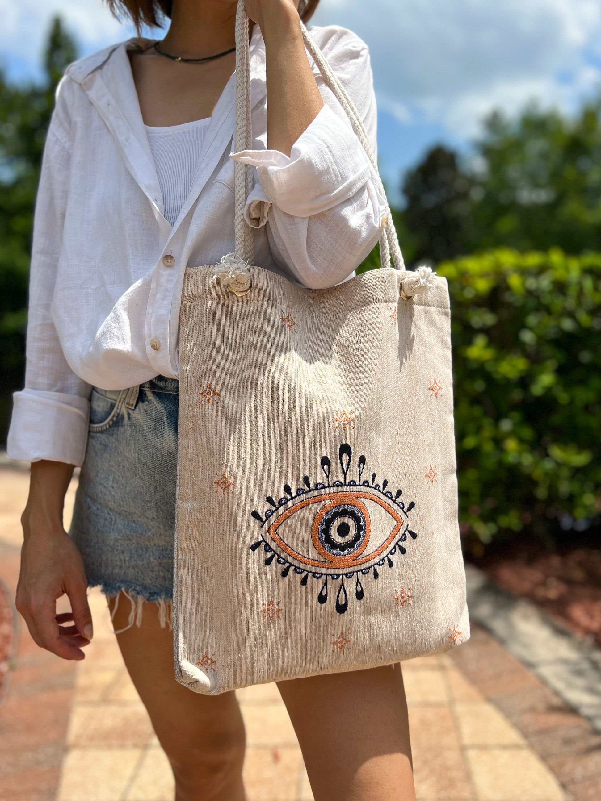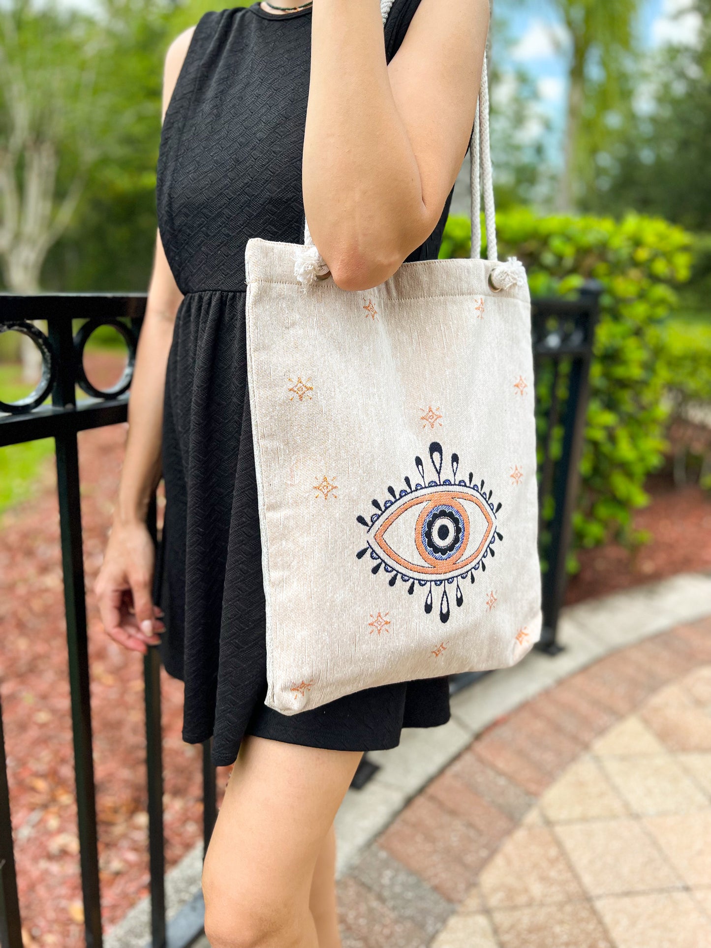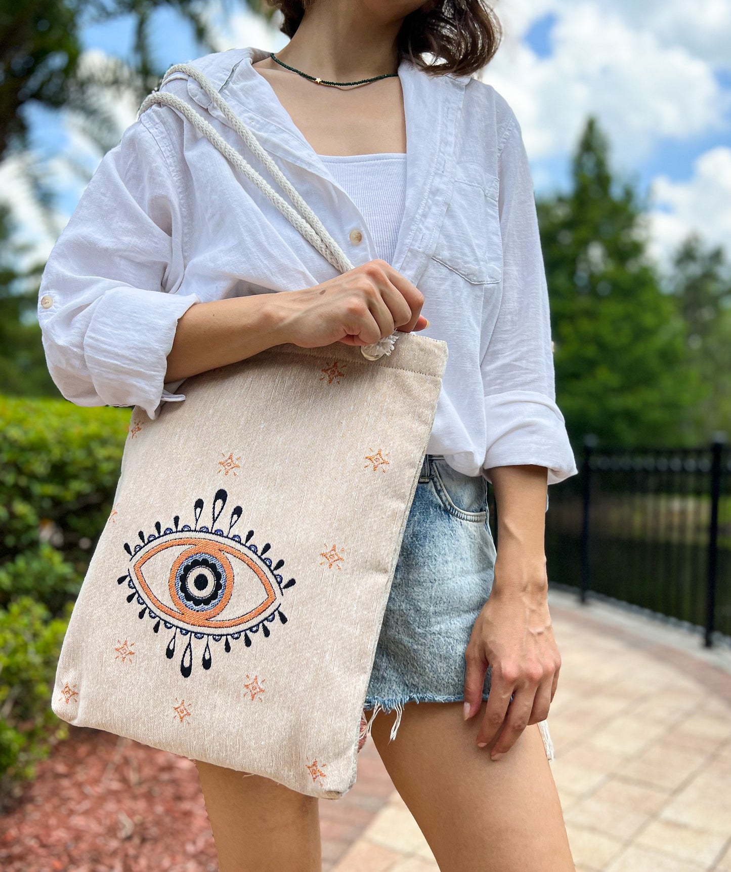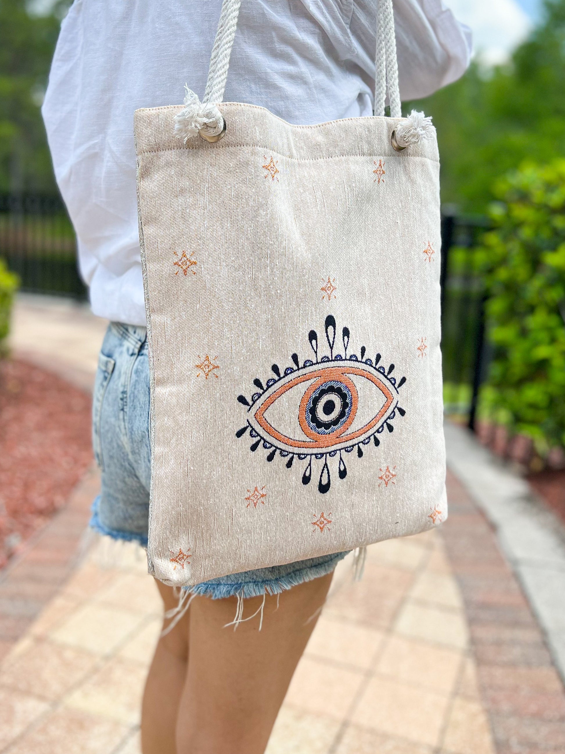 Evil Eye Beach Bag, Woven Tote Bag, Boho Shoulder Bag