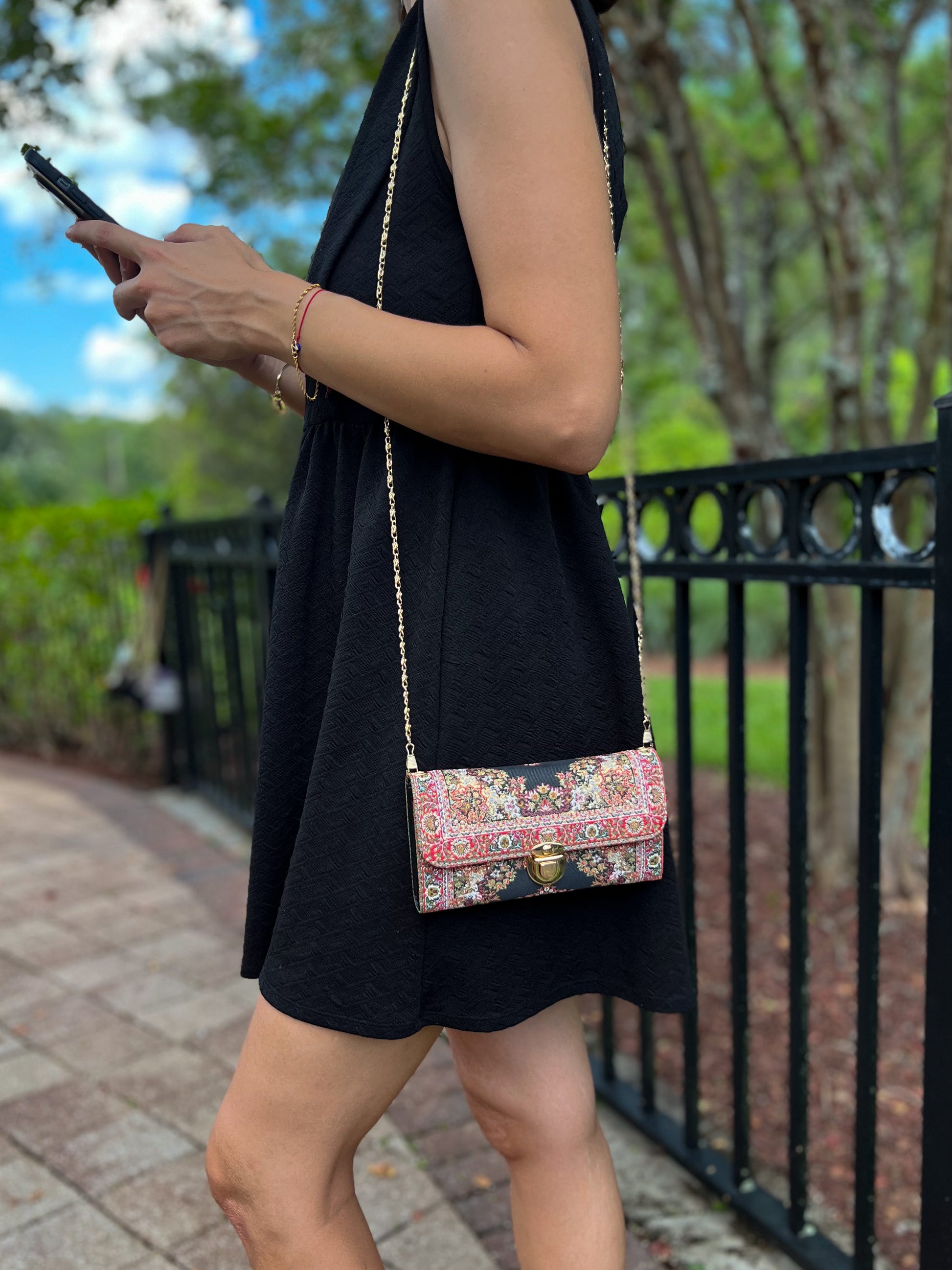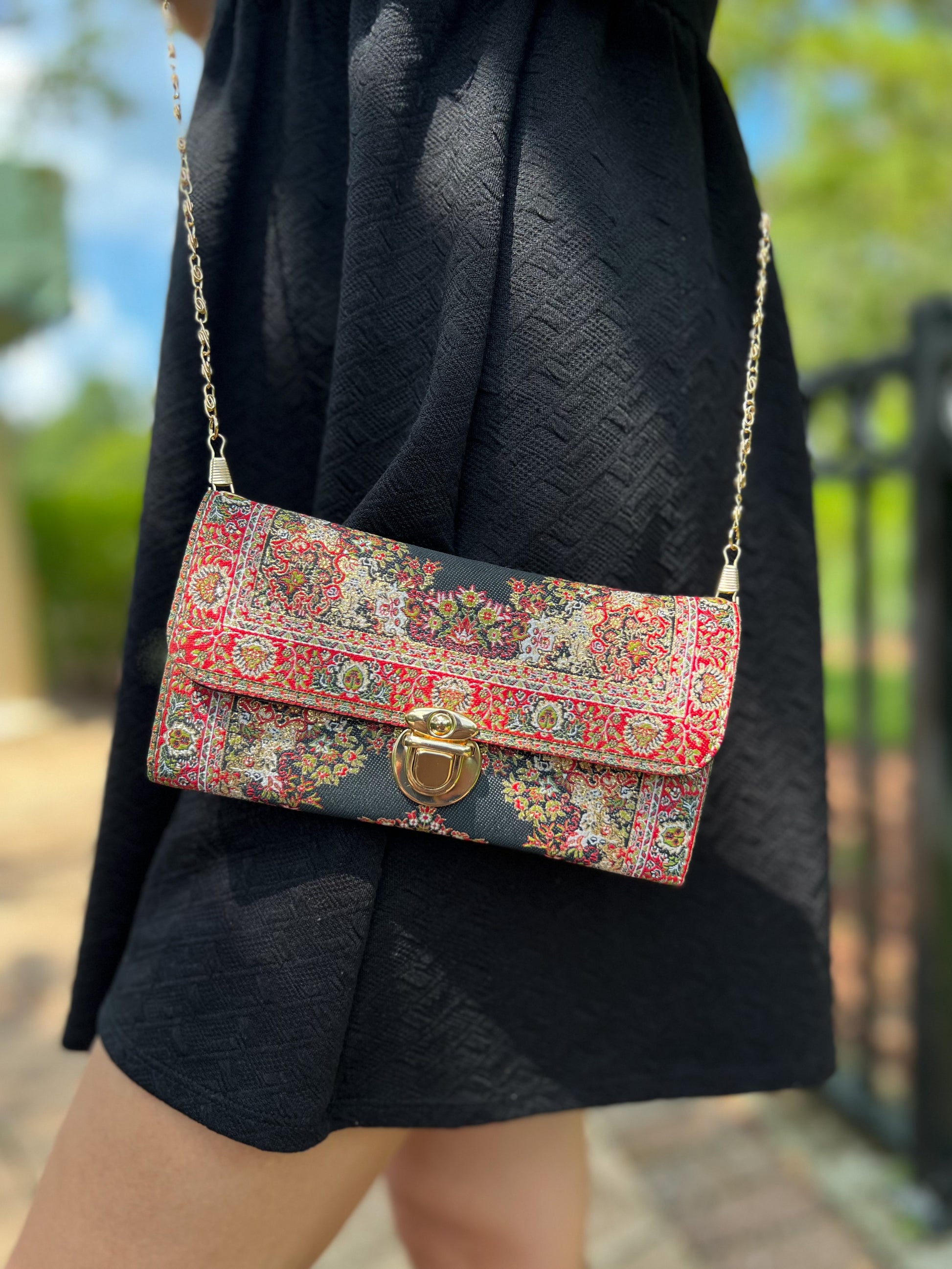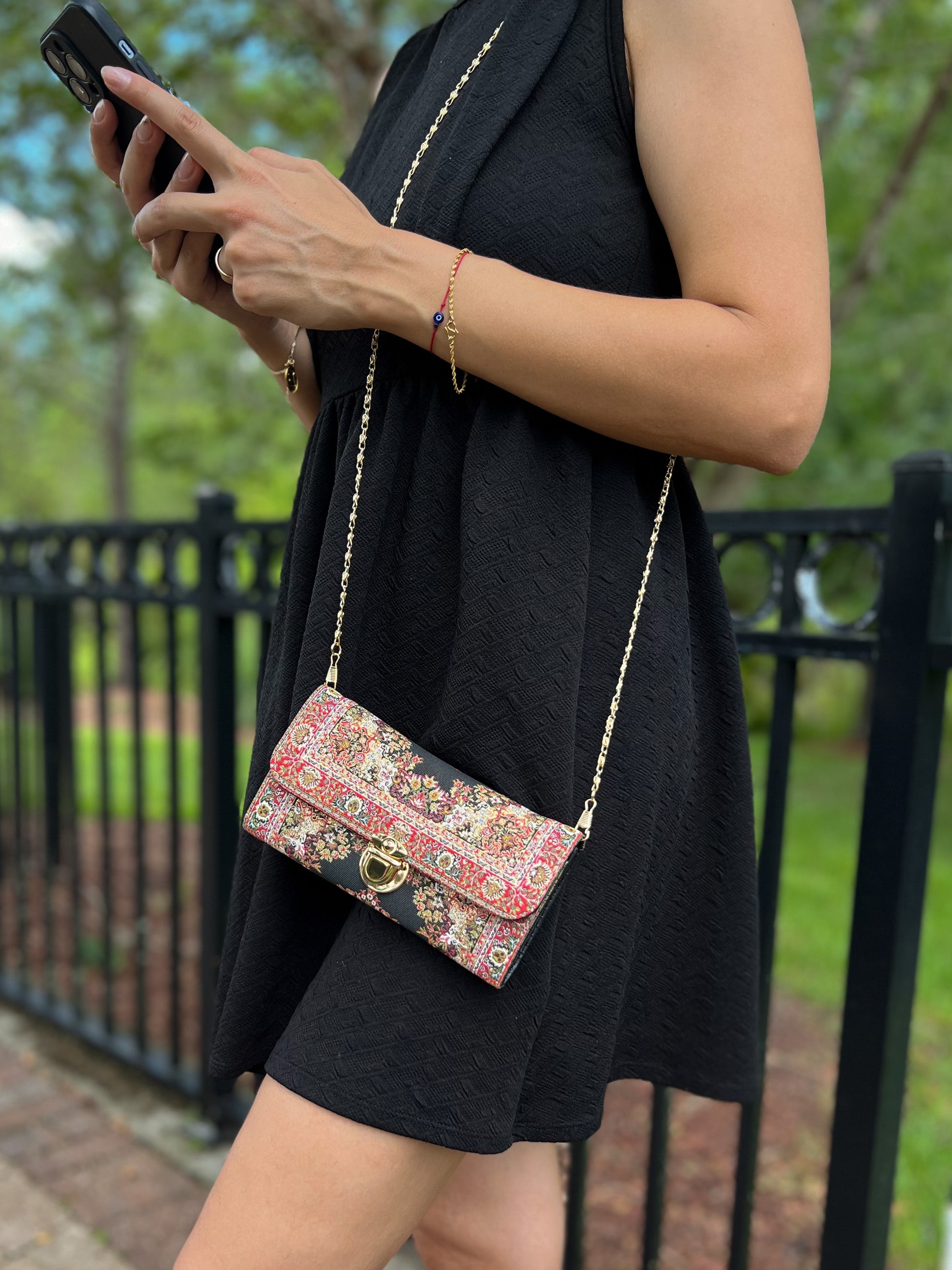 This Boho crossbody bag is made of Turkish carpet patterned brocade fabric and vegan leather. It has a metal clasp and metal chain. It can be used as a trifold wallet when you take the chain out.