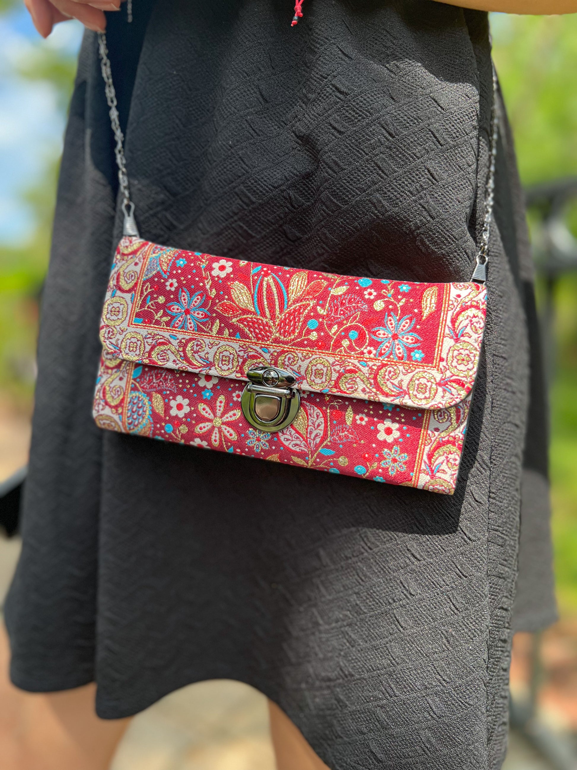 This Boho crossbody bag is made of Turkish carpet patterned brocade fabric and vegan leather. It has a metal clasp and metal chain. It can be used as a trifold wallet when you take the chain out.