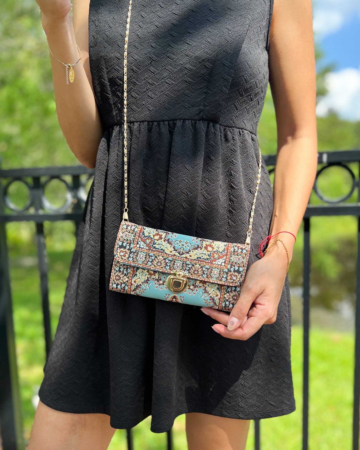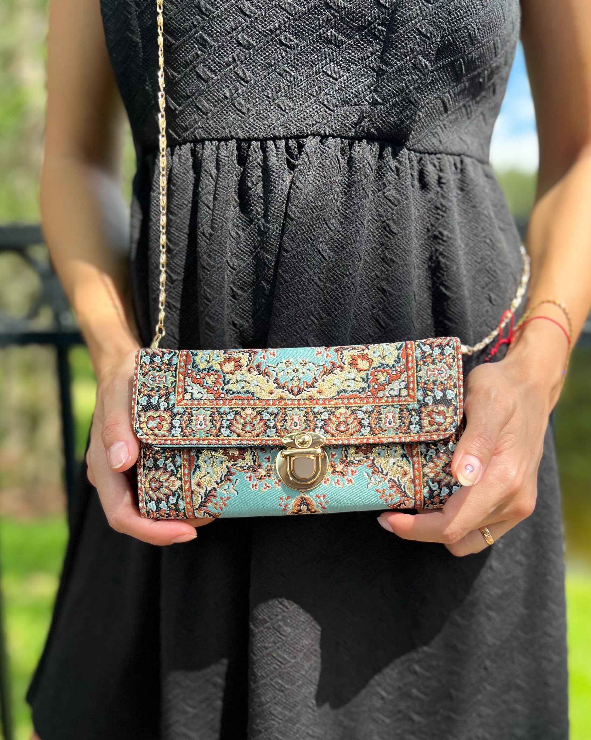 This Boho crossbody bag is made of Turkish carpet patterned brocade fabric and vegan leather. It has a metal clasp and metal chain. It can be used as a trifold wallet when you take the chain out.
