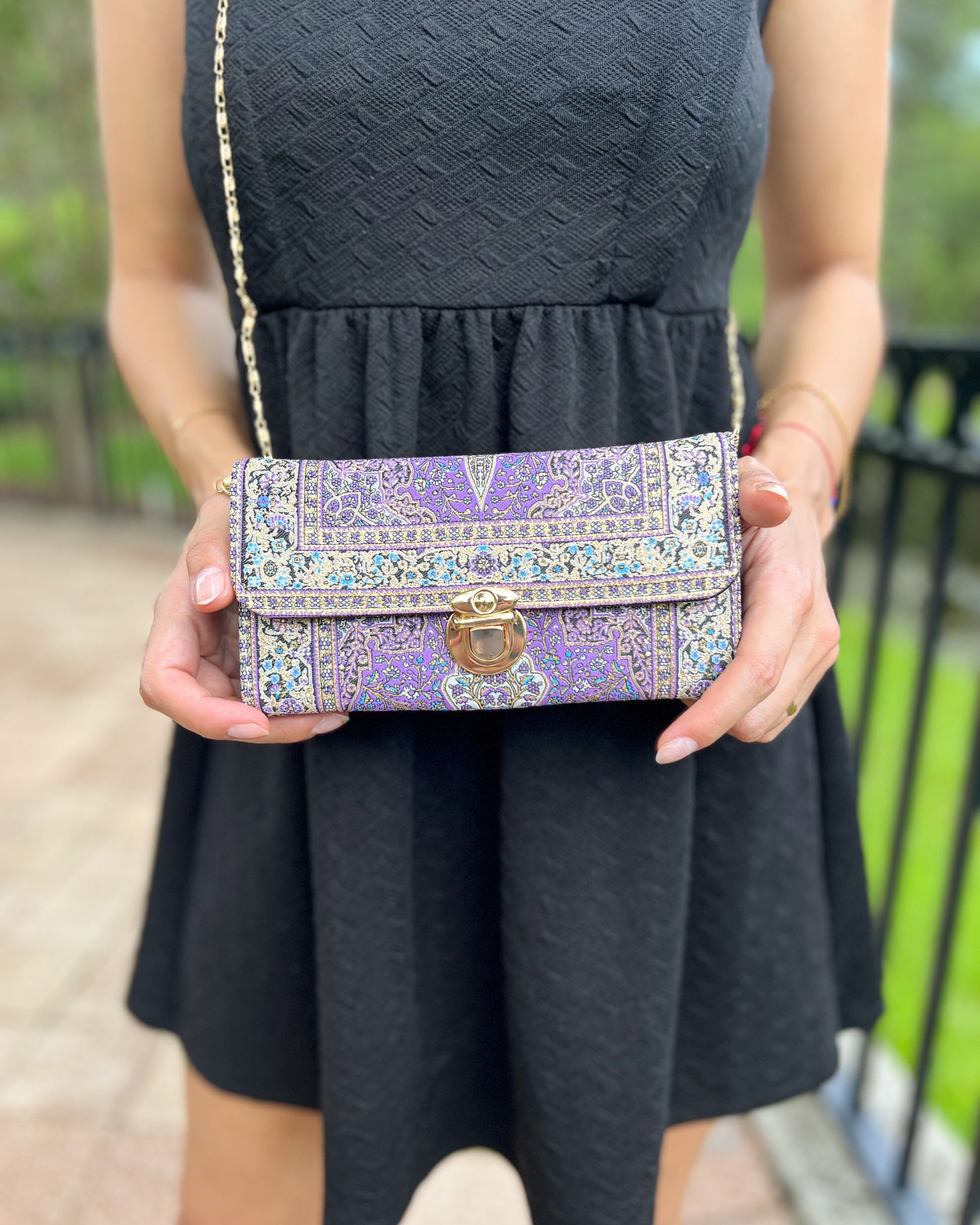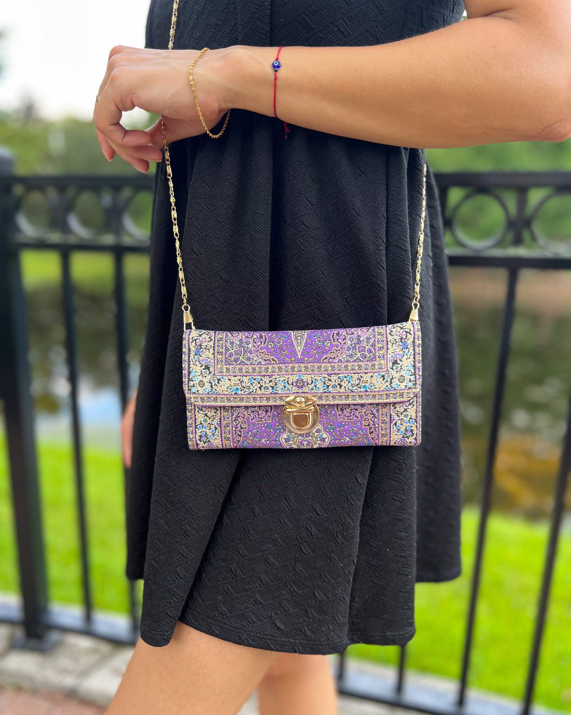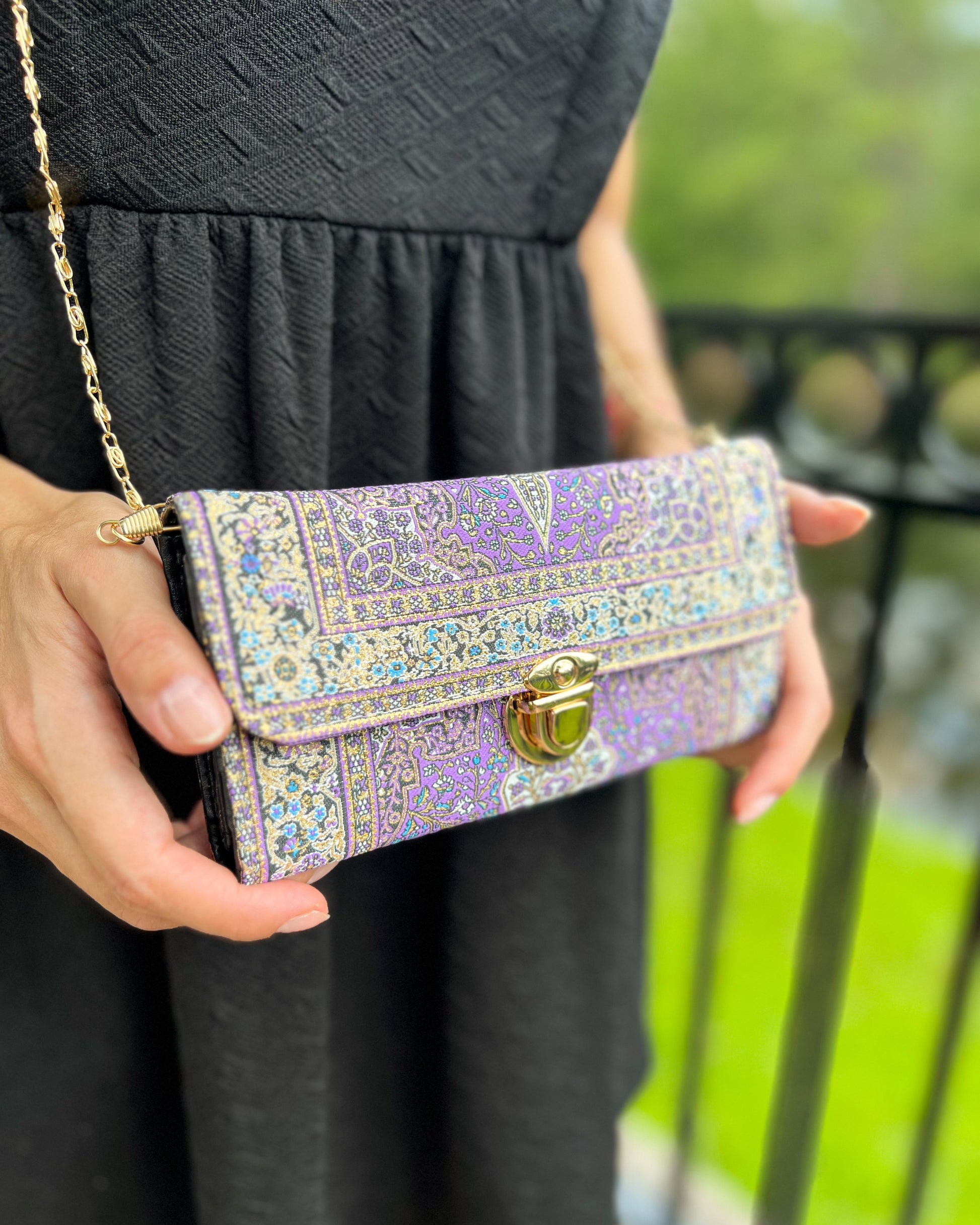 This Boho crossbody bag is made of Turkish carpet patterned brocade fabric and vegan leather. It has a metal clasp and metal chain. It can be used as a trifold wallet when you take the chain out.