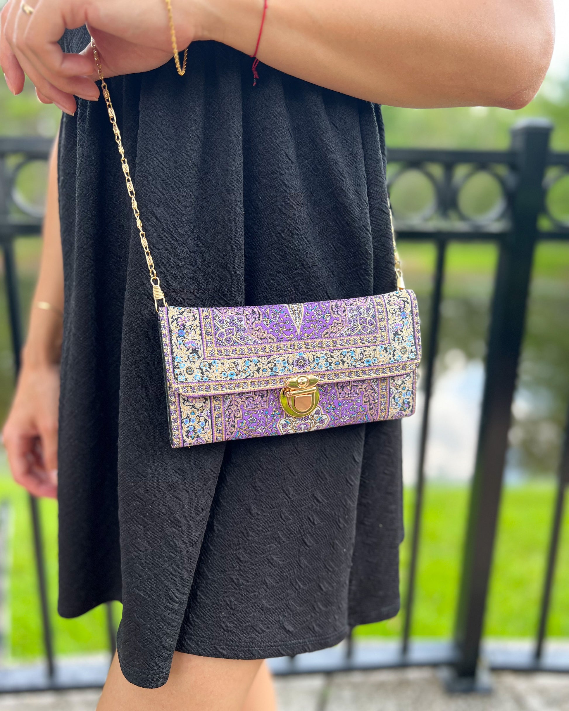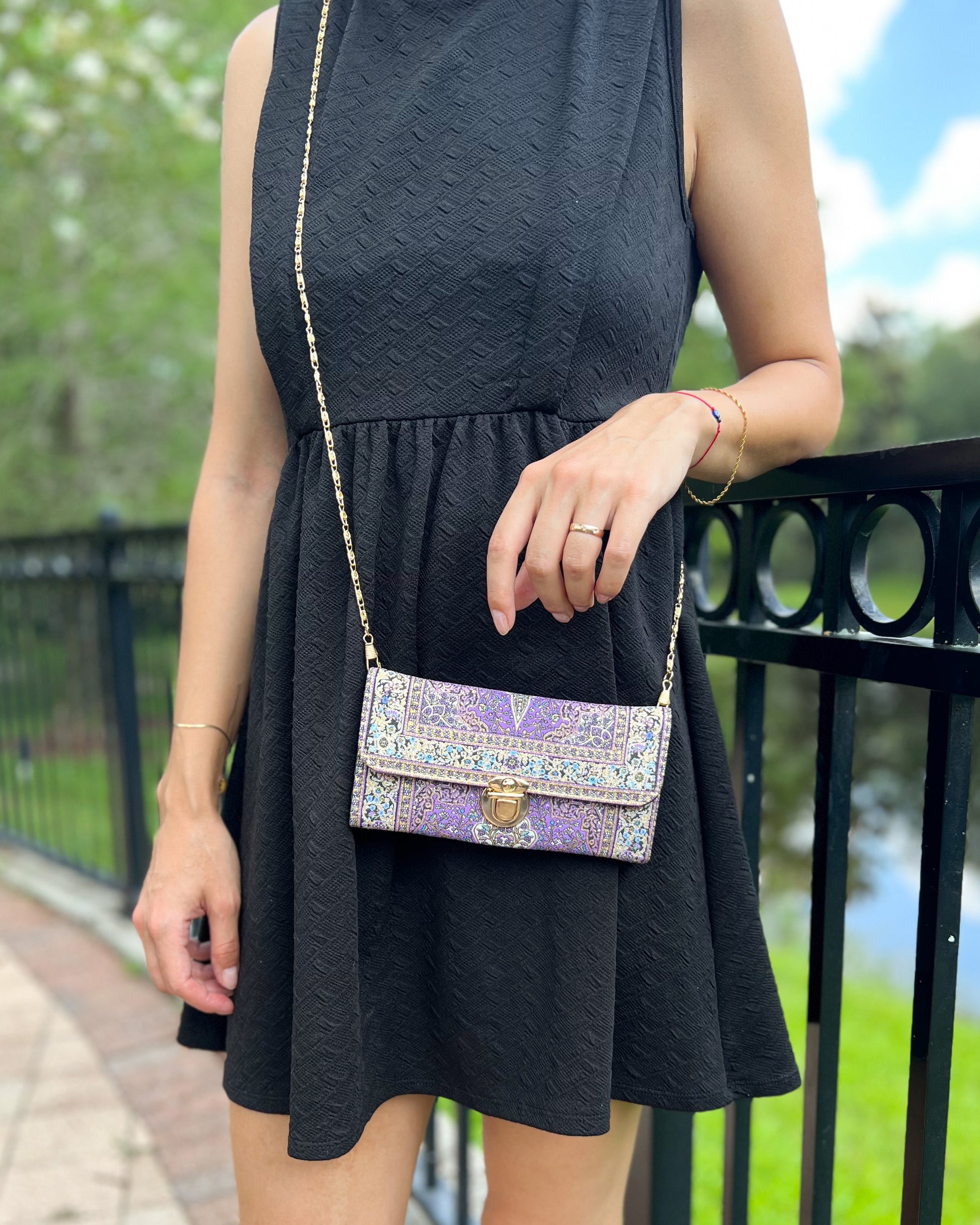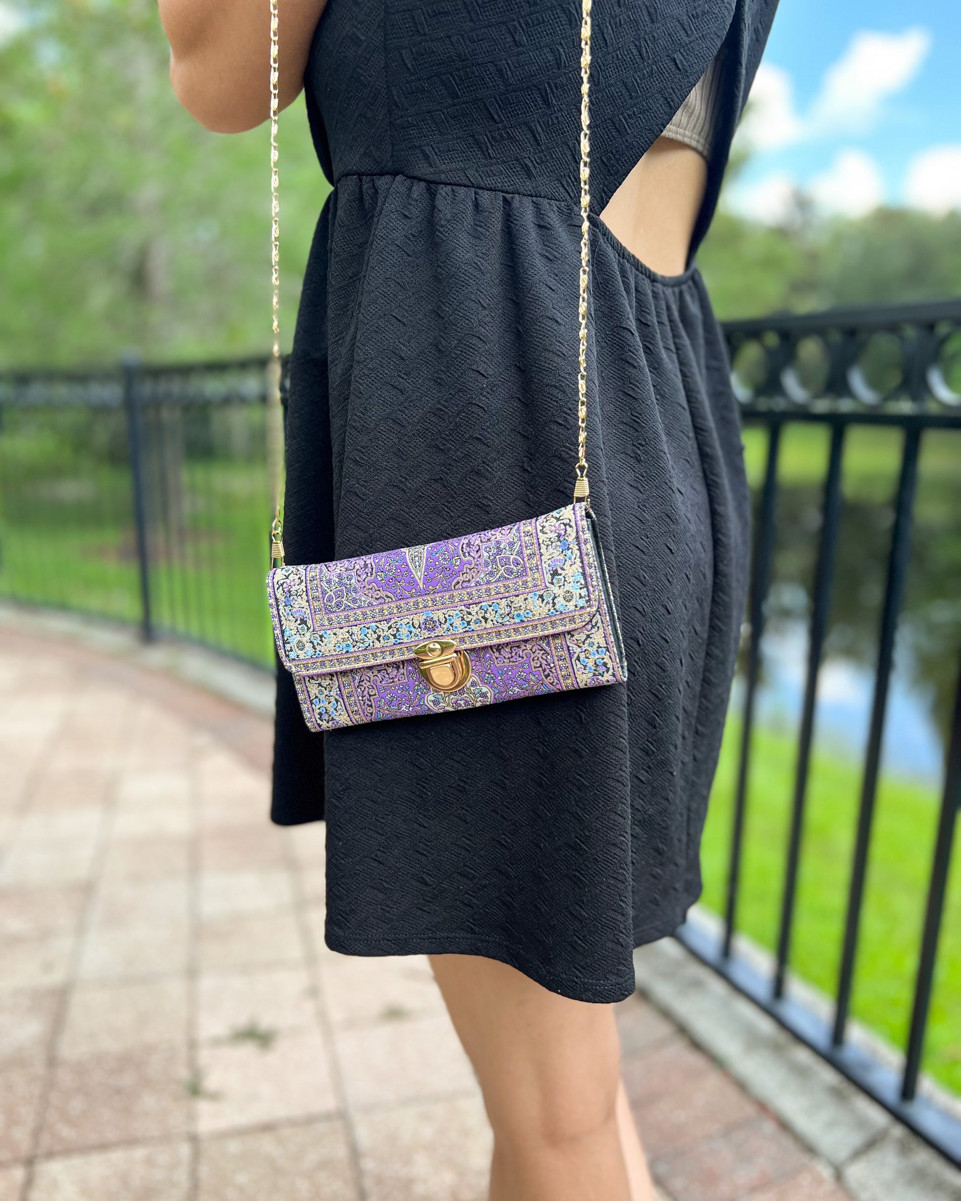 This Boho crossbody bag is made of Turkish carpet patterned brocade fabric and vegan leather. It has a metal clasp and metal chain. It can be used as a trifold wallet when you take the chain out.