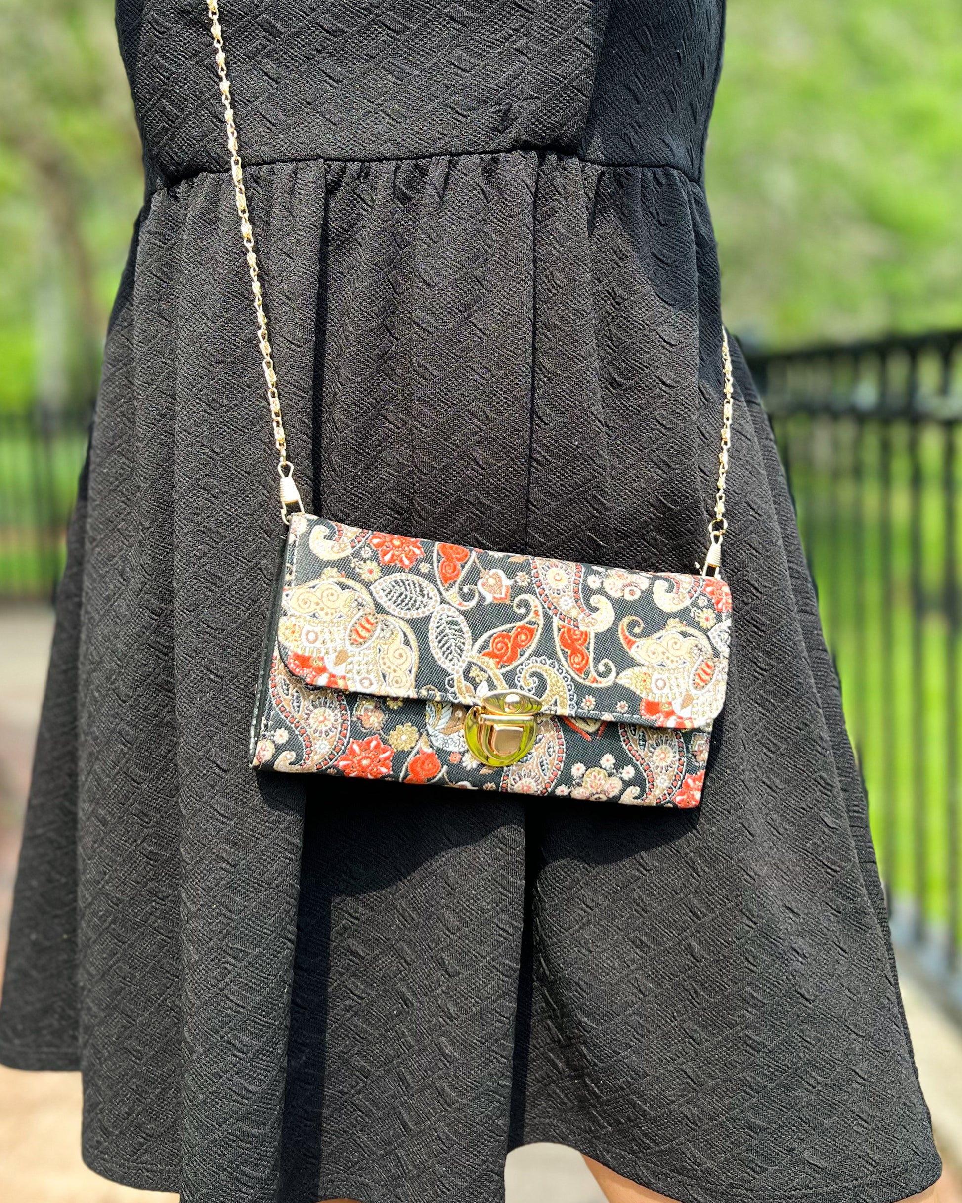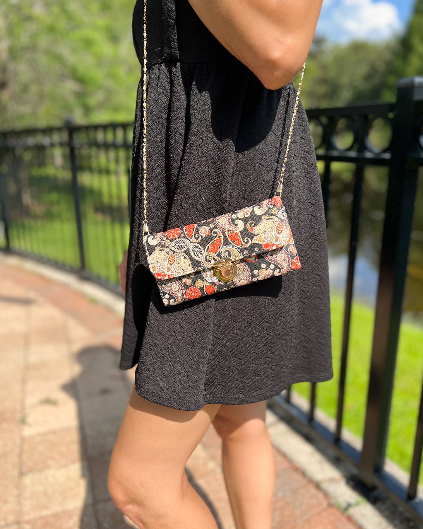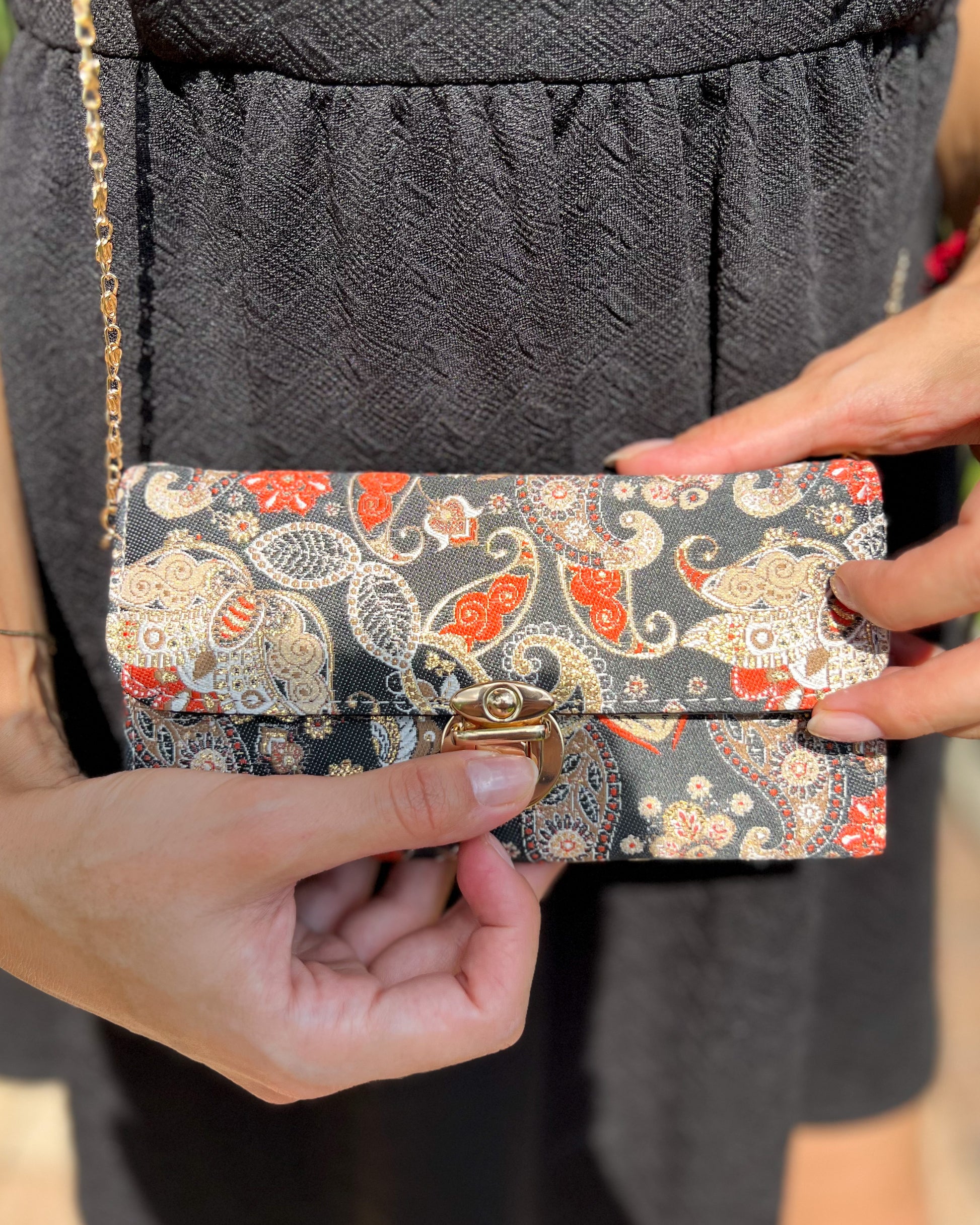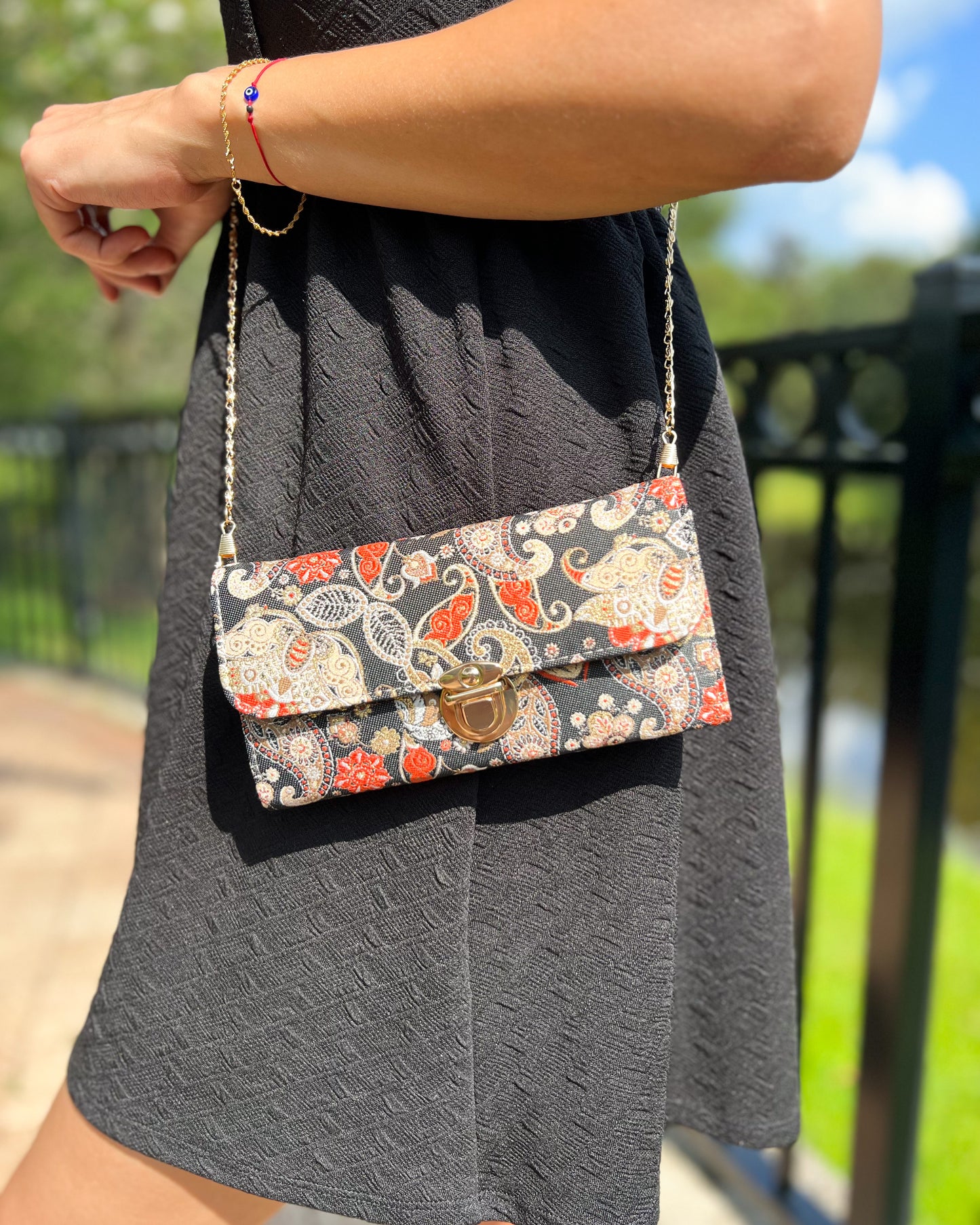 This Boho crossbody bag is made of Turkish carpet patterned brocade fabric and vegan leather. It has a metal clasp and metal chain. It can be used as a trifold wallet when you take the chain out.
