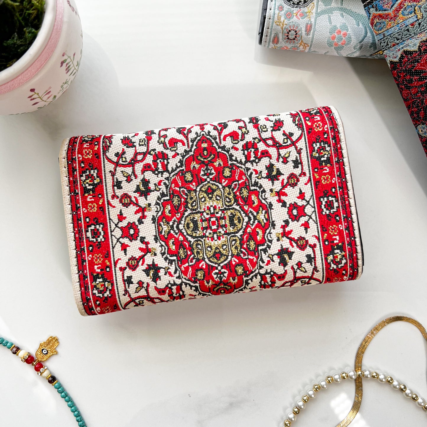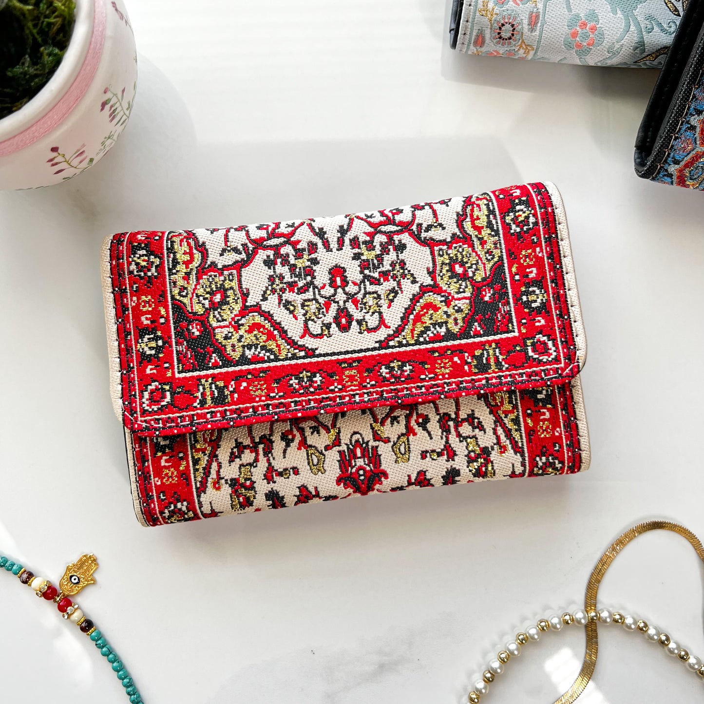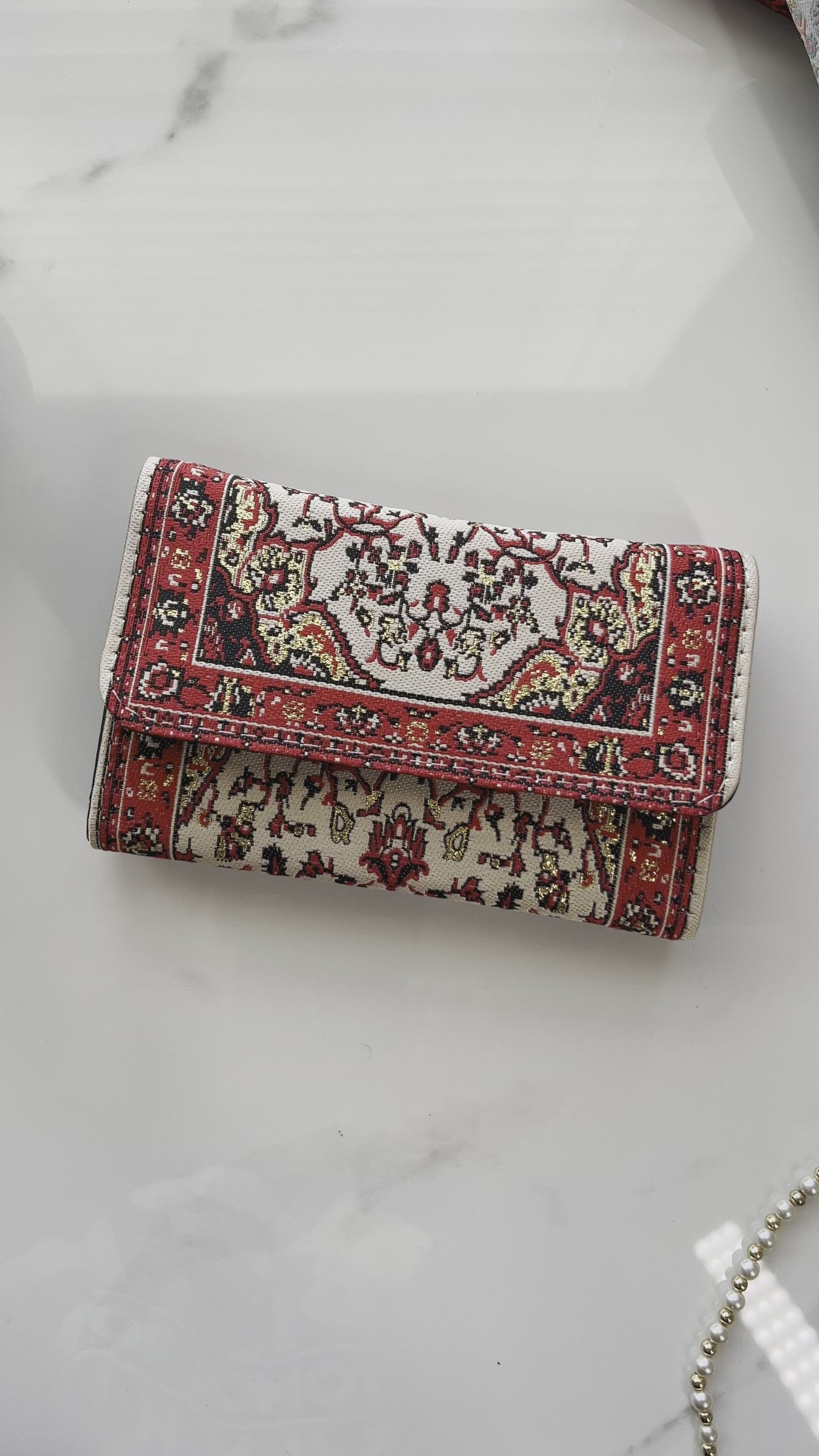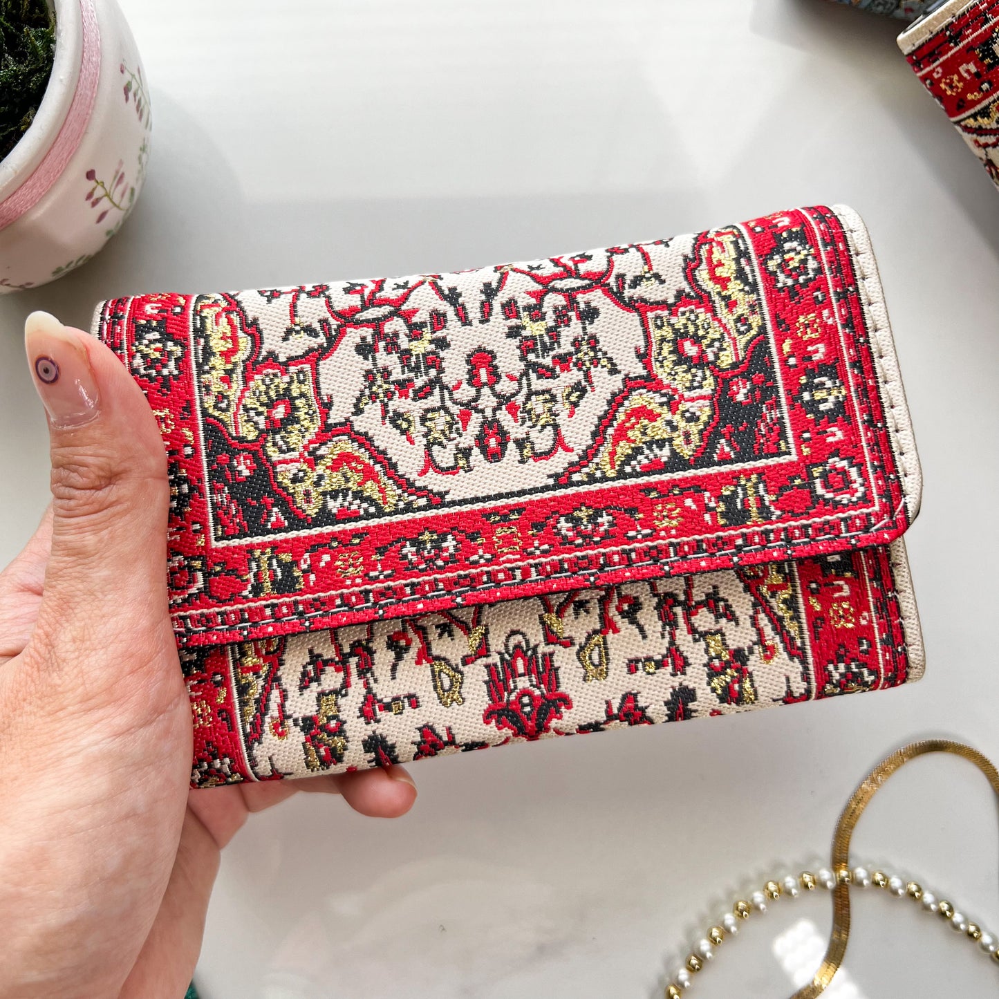 Our Boho wallet is crafted from vegan leather and brocade fabric inspired from Turkish carpet pattern. You will love the soft glimmering gold touch giving these handmade Turkish wallets a luxurious look. The design of the fabric is not a print, it's woven.