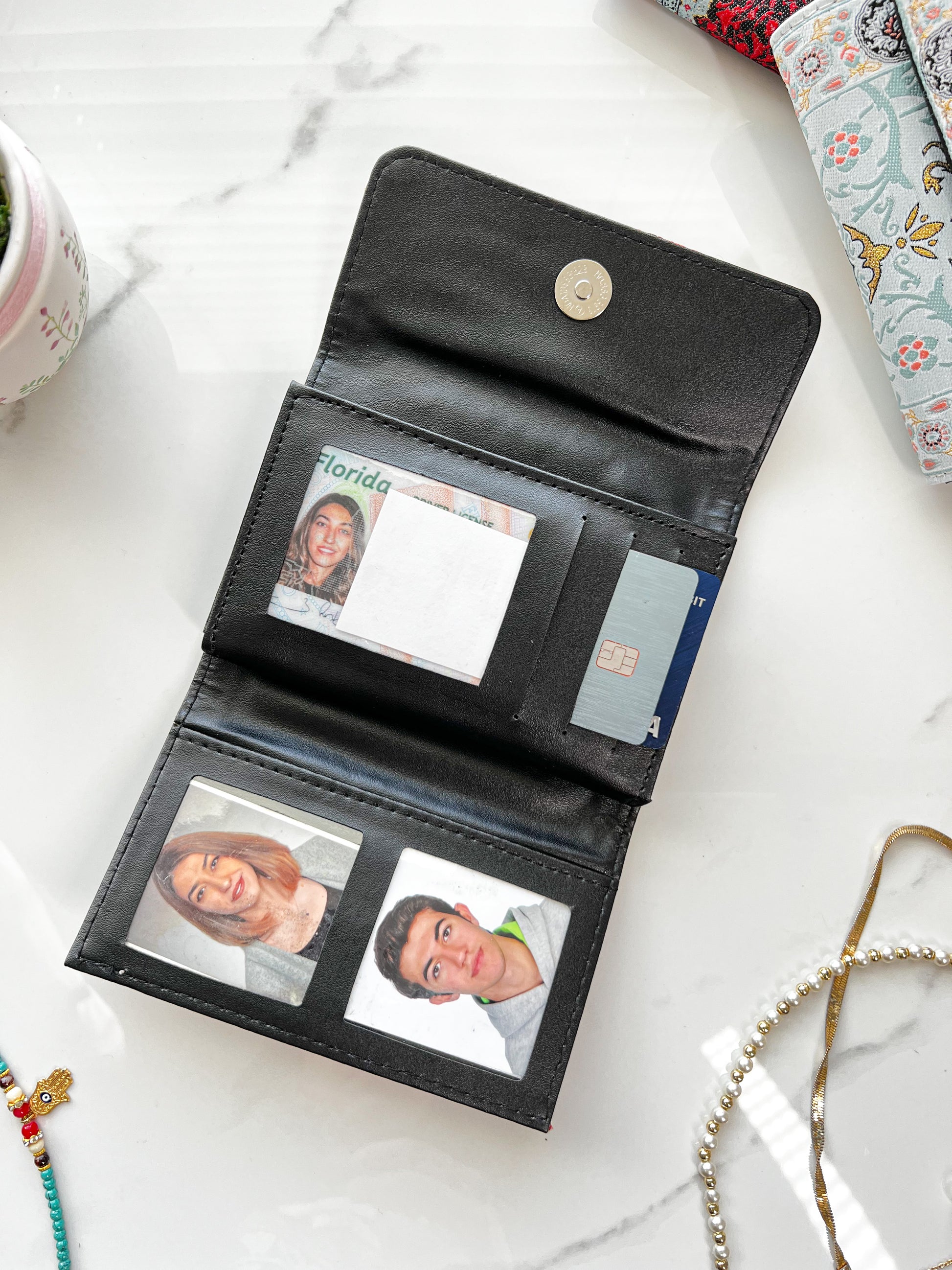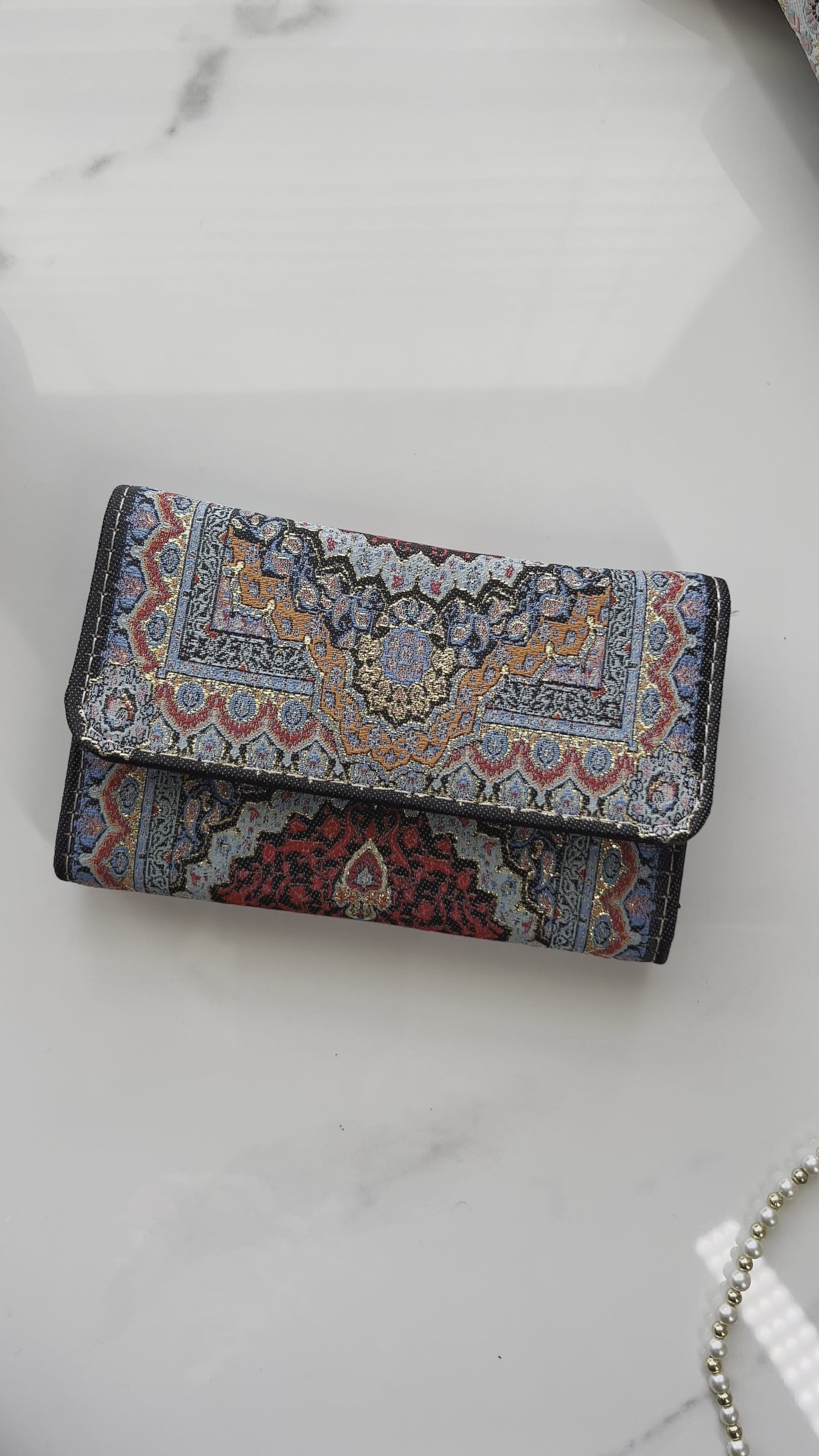 Our Boho wallet is crafted from vegan leather and brocade fabric inspired from Turkish carpet pattern. You will love the soft glimmering gold touch giving these handmade Turkish wallets a luxurious look. The design of the fabric is not a print, it's woven.