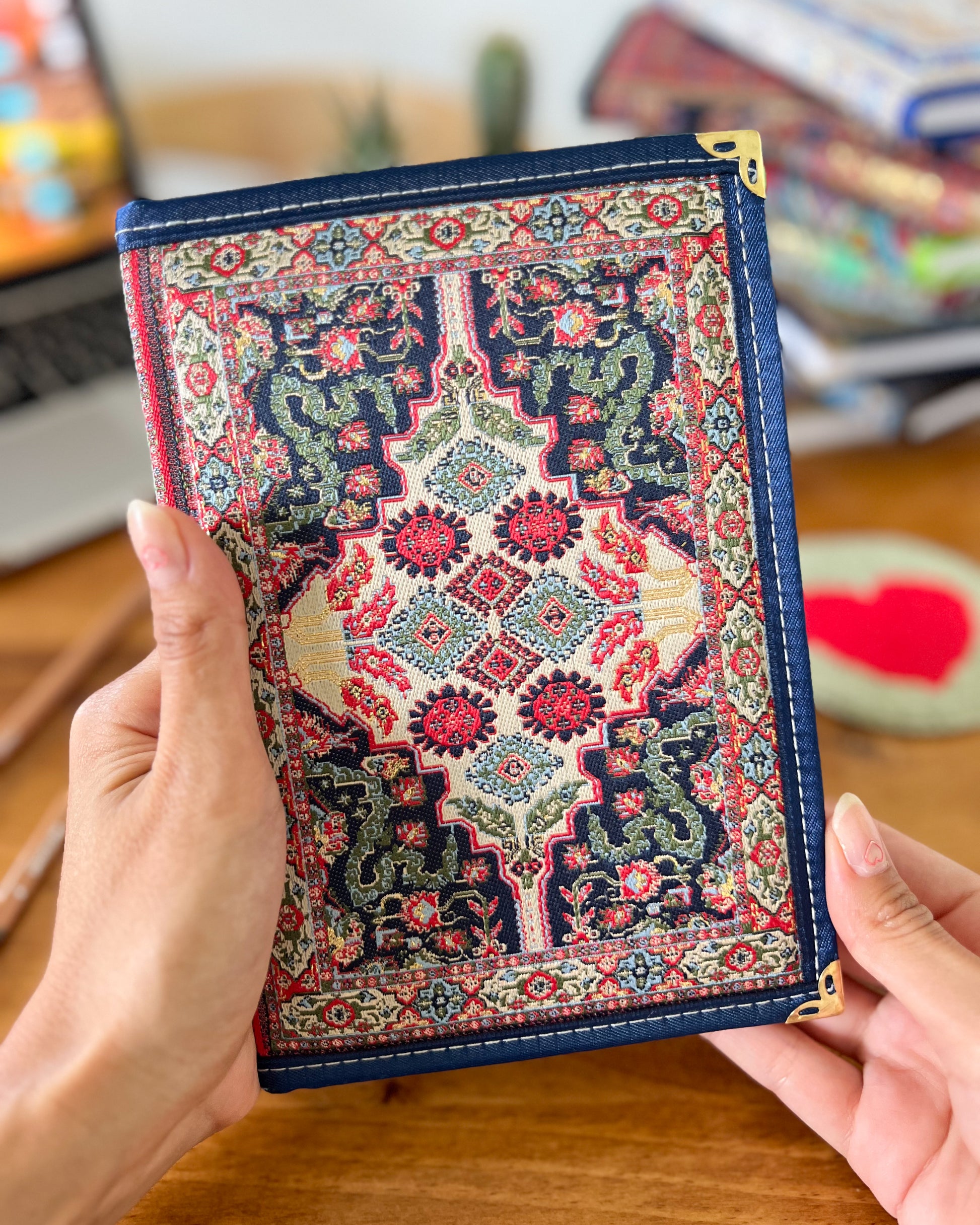 Our bohemian fabric notebooks are perfect for Diaries, Journals and a perfect companion for your work and meetings or school or even travels. Each boho notebook is filled with lined pages and has hardcover with Turkish carpet pattern designed brocade fabric on the top with a gold, glittery look and soft and luxurious touch.