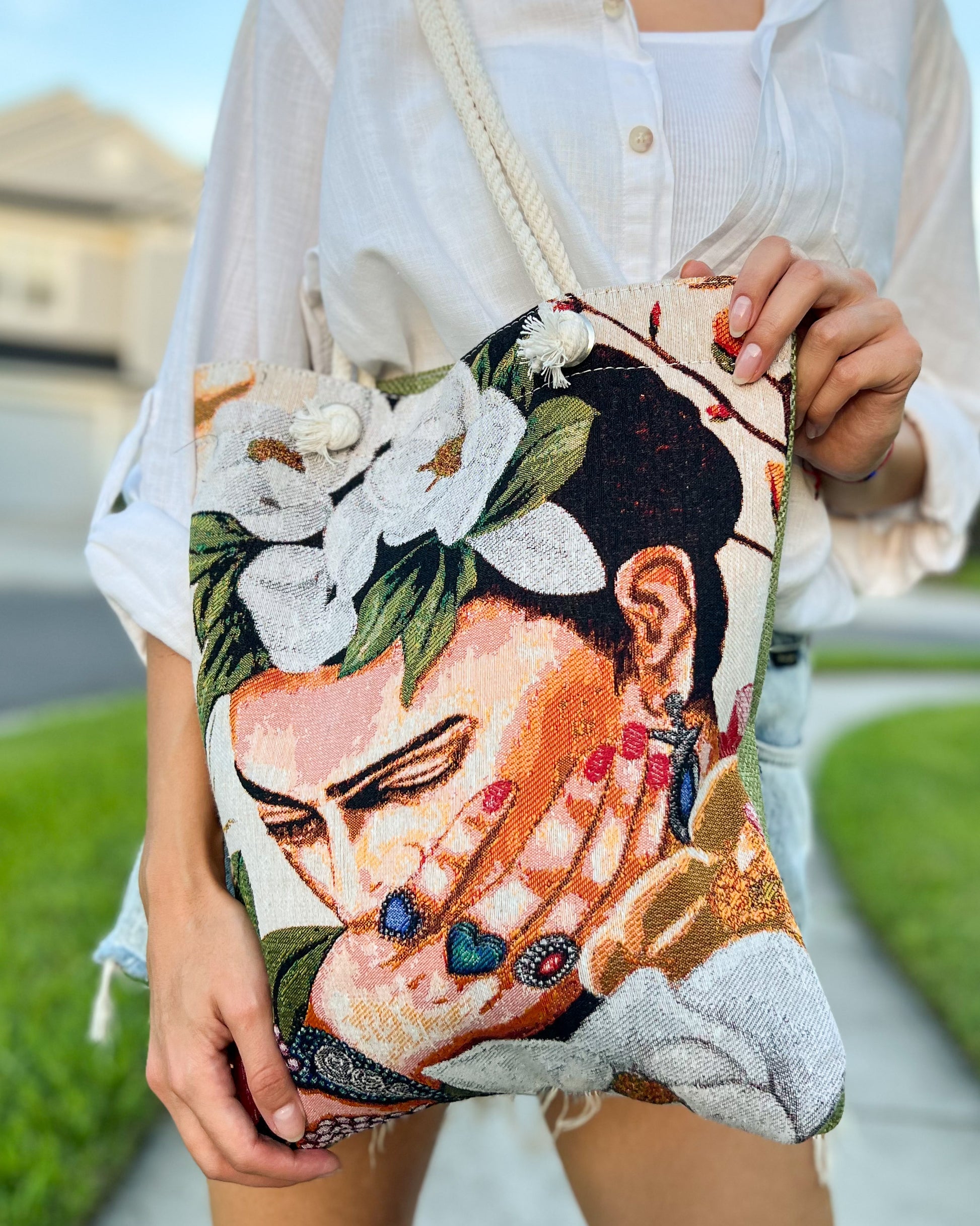 Woven Fabric Tote Bag, Frida Kahlo Design Shoulder Bag