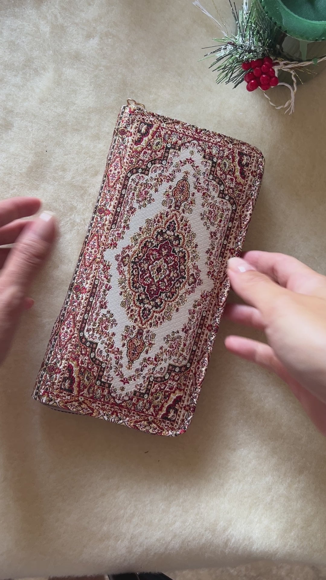 This handmade boho wallet is perfect for your everyday use or a unique gift for her. This wallet is handmade with small details. It has a soft feel and glittery look with gold threads besides a lot of space with 12 card slots and a zipper coin pocket. You can even put your phone in this handmade wallet. It is lightweight and slim for a thin bag. The fabric inspired by Turkish carpet pattern is giving an elegant touch and the vegan leather inside is giving a comfortable use.