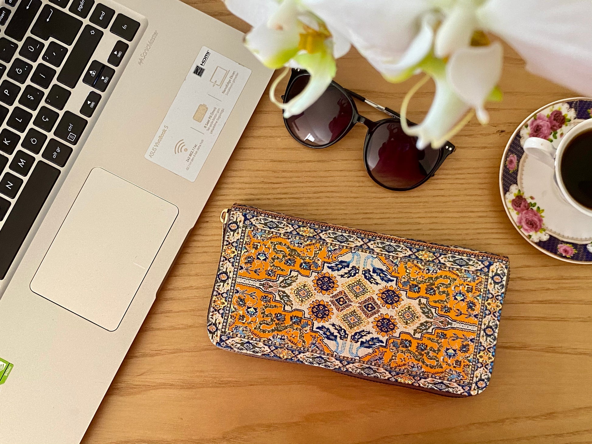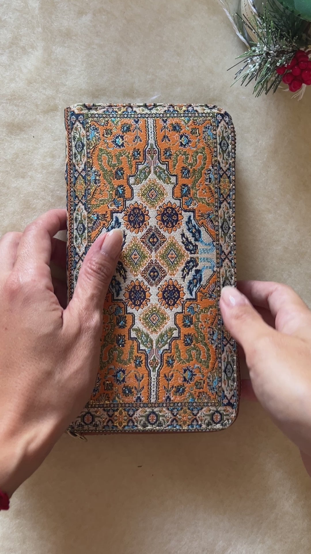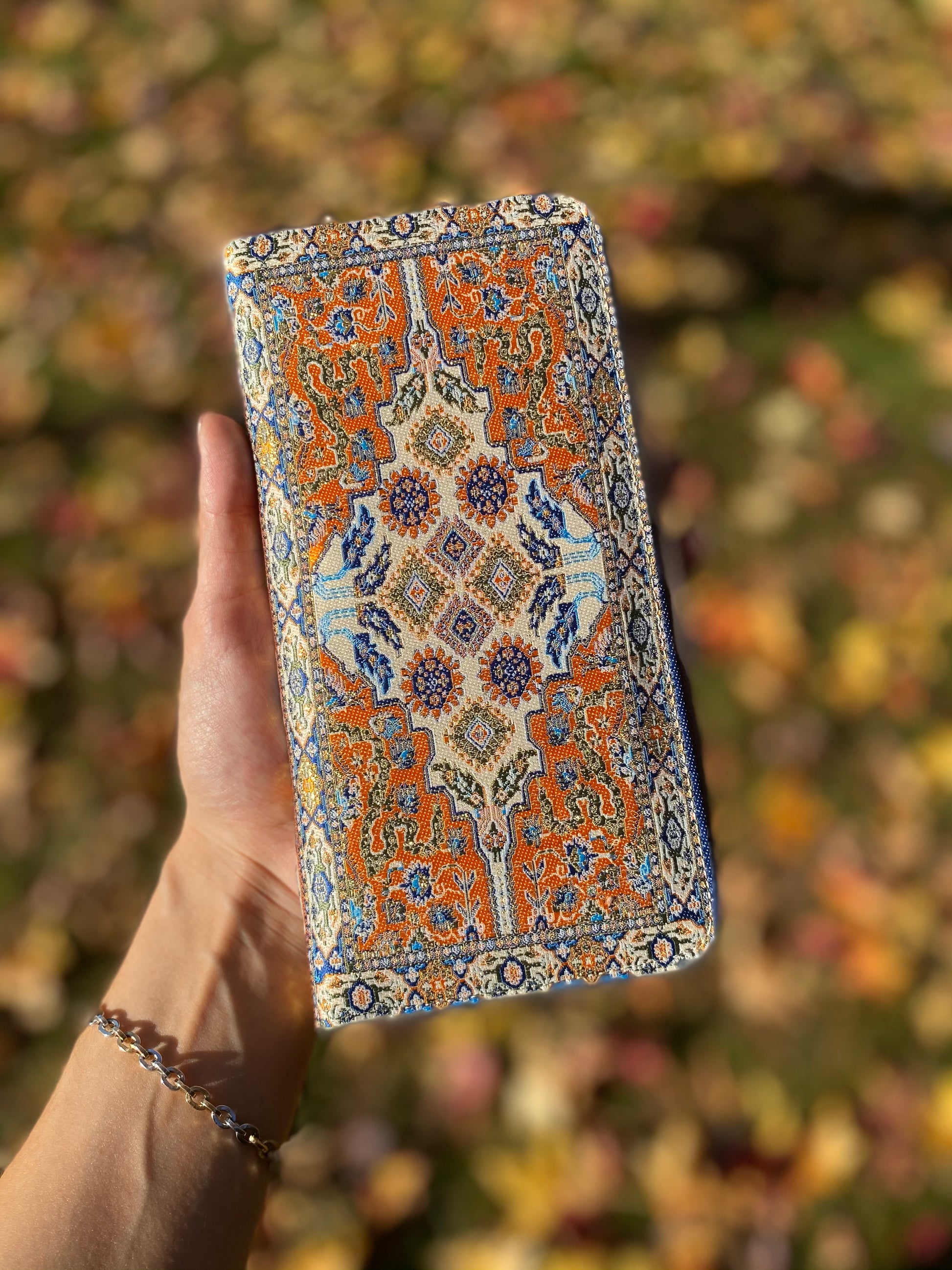This handmade boho wallet is an amazing Christmas Gift, Anniversary Gift, Mother's Day Gift or Birthday Gift. It is a spacious zip around wallet which is very suitable for your everyday use or a unique gift for her. It has a soft feel and glittery look with gold threads besides a lot of space with 12 card slots and a zipper coin pocket. You can even put your phone in this bohemian wallet. It is lightweight and slim for a thin bag. The fabric inspired by Turkish carpet pattern is giving an elegant touch and the vegan leather inside is giving a comfortable use.