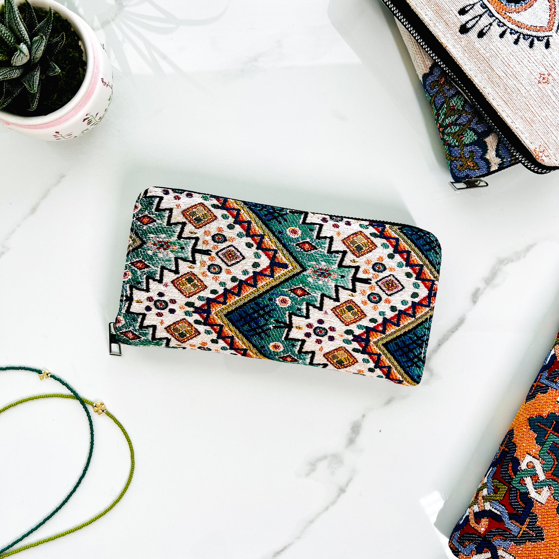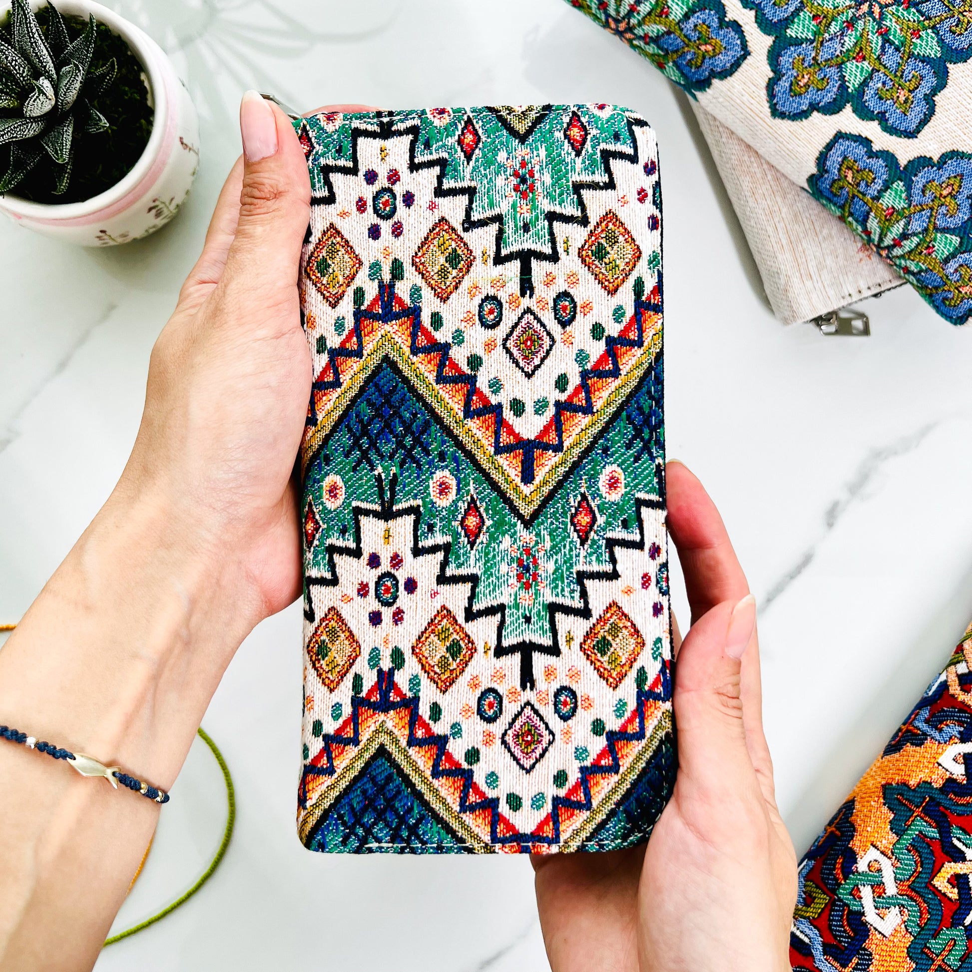 Our Boho wallets are perfect Mother's Day Gift, Birthday Gift for your bestie and anniversary gift for her. They are %100 cotton fabric and vegan leather. Look no further than our beautifully crafted boho rug design women's wallet!