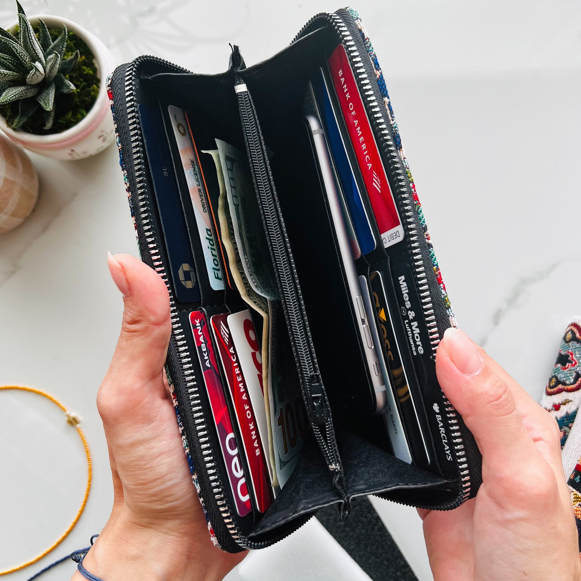 Made of high-quality, woven fabric that is %100 cotton, this women's wallet is built to last and will be a cherished gift for years to come. The wallet boasts 12 card slots that can easily hold all her credit cards, ID cards, and membership cards, and even a cell phone. Additionally, it includes a convenient zipper pocket for her coins, ensuring that her money stays safe and secure.