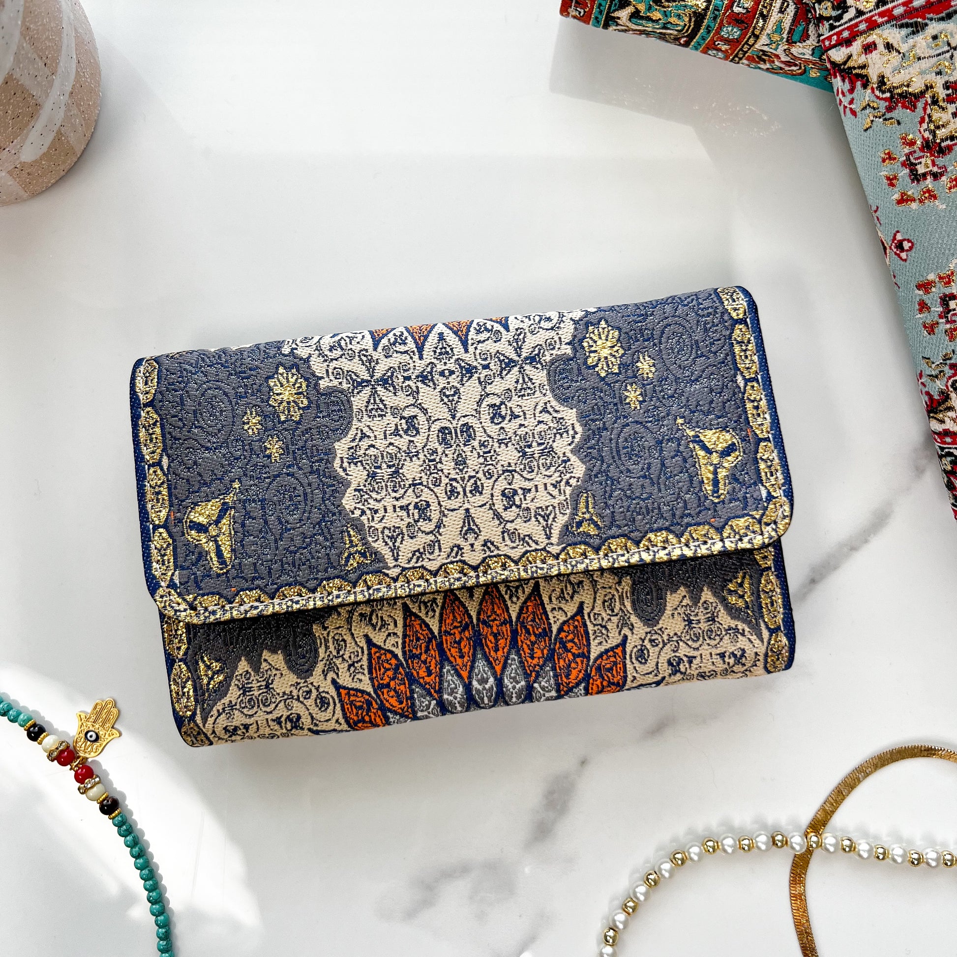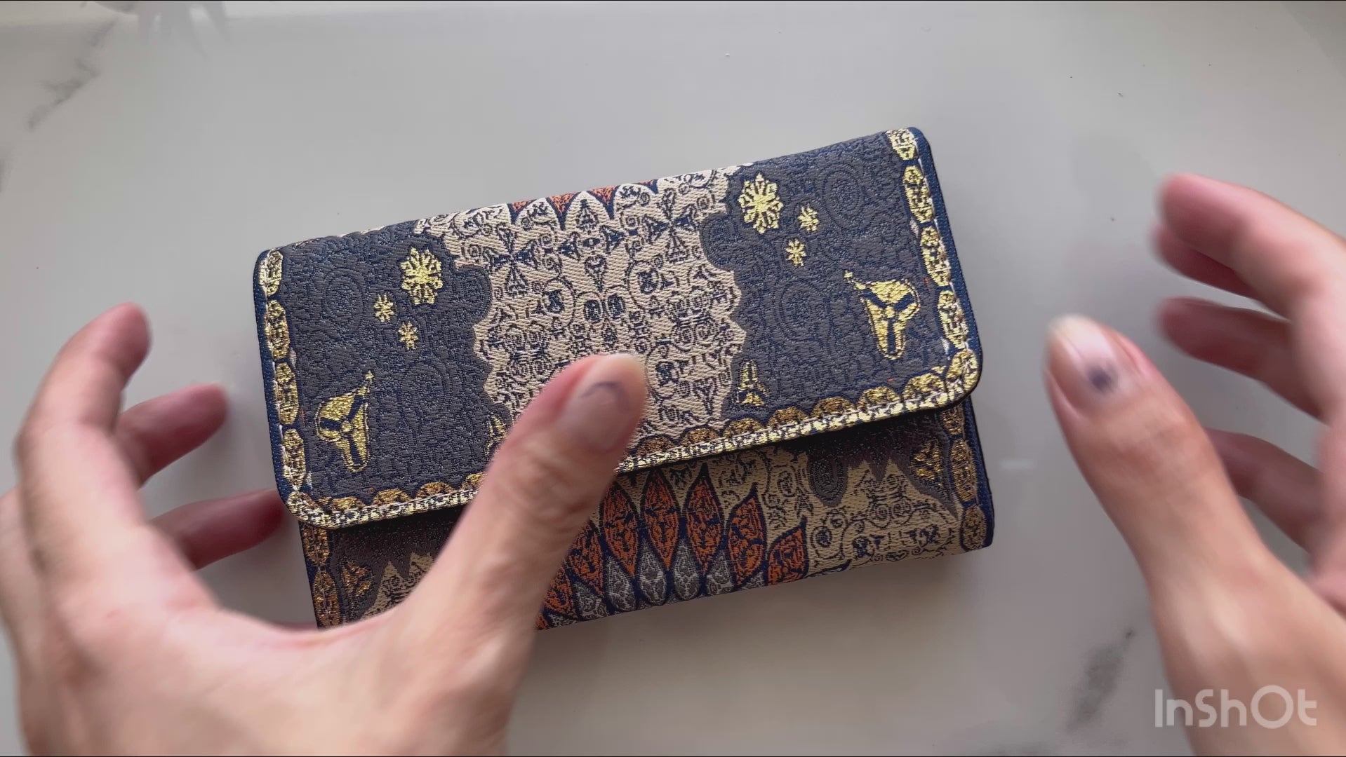 Our Boho wallet is crafted from vegan leather and brocade fabric inspired from Turkish carpet pattern. You will love the soft glimmering gold touch giving these handmade Turkish wallets a luxurious look. The design of the fabric is not a print, it's woven.