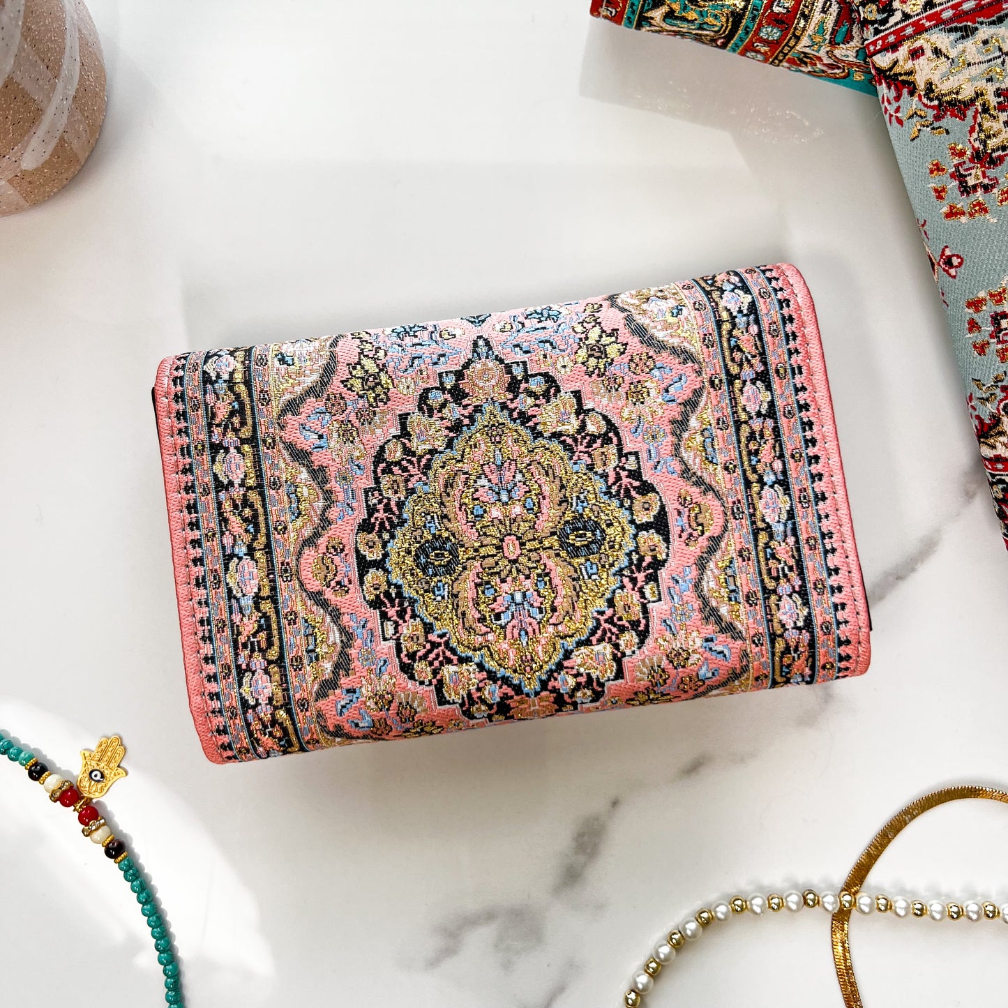 Our Boho wallet is crafted from vegan leather and brocade fabric inspired from Turkish carpet pattern. You will love the soft glimmering gold touch giving these handmade Turkish wallets a luxurious look. The design of the fabric is not a print, it's woven.