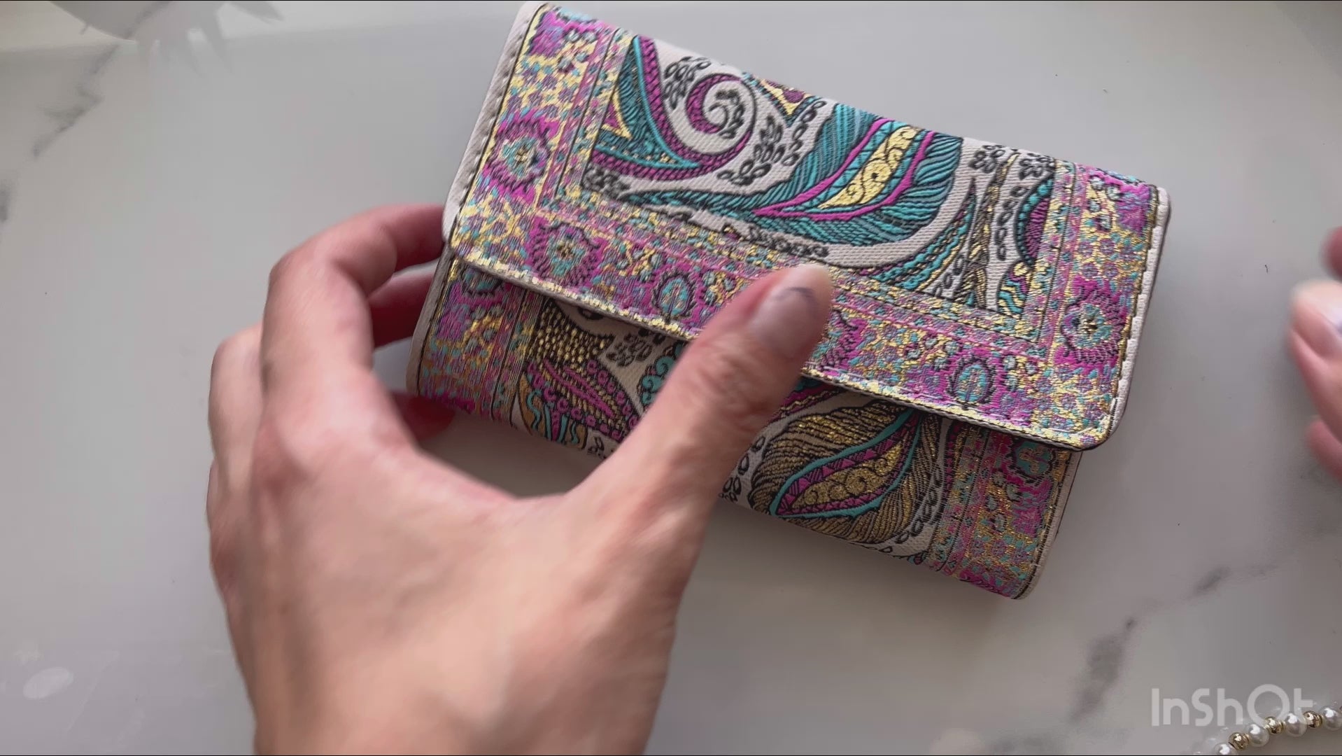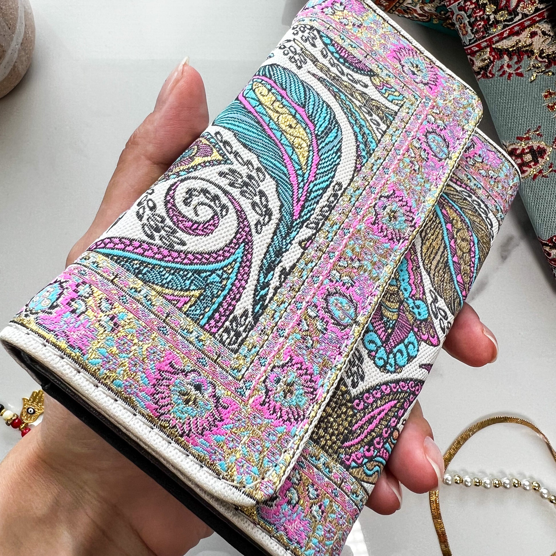 Our Boho wallet is crafted from vegan leather and brocade fabric inspired from Turkish carpet pattern. You will love the soft glimmering gold touch giving these handmade Turkish wallets a luxurious look. The design of the fabric is not a print, it's woven.