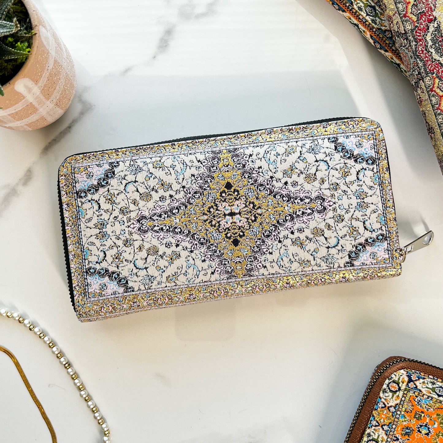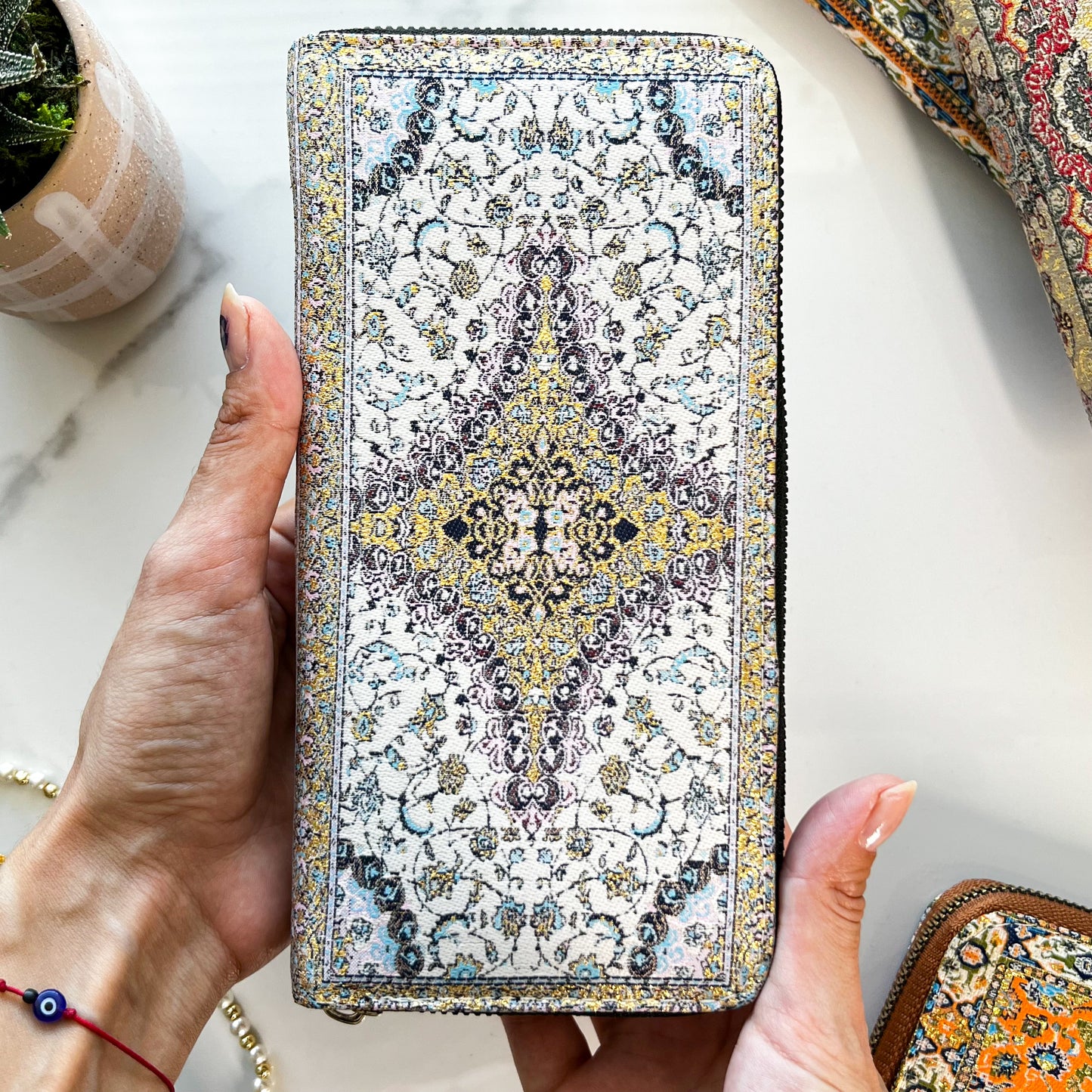 This handmade boho wallet is an amazing Christmas Gift, Anniversary Gift, Mother's Day Gift or Birthday Gift. It is a spacious zip around wallet which is very suitable for your everyday use or a unique gift for her. It has a soft feel and glittery look with gold threads besides a lot of space with 12 card slots and a zipper coin pocket. You can even put your phone in this bohemian wallet. It is lightweight and slim for a thin bag. The fabric inspired by Turkish carpet pattern is giving an elegant touch and the vegan leather inside is giving a comfortable use.