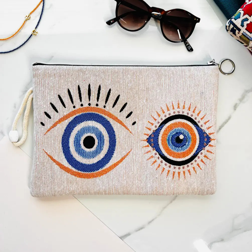 Our stylish and functional slim clutch for women, featuring captivating evil eye designs and thoughtful details. This versatile accessory is designed to complement your outfit while providing convenient storage for your essentials and even your iPad! With a sleek and slim profile, this clutch effortlessly fits into your hand or can be worn with the included wristlet for a hands-free option. The padded interior offers secure storage for your iPad and your cell phone, ensuring it stays protected from scratches and bumps while on the go.