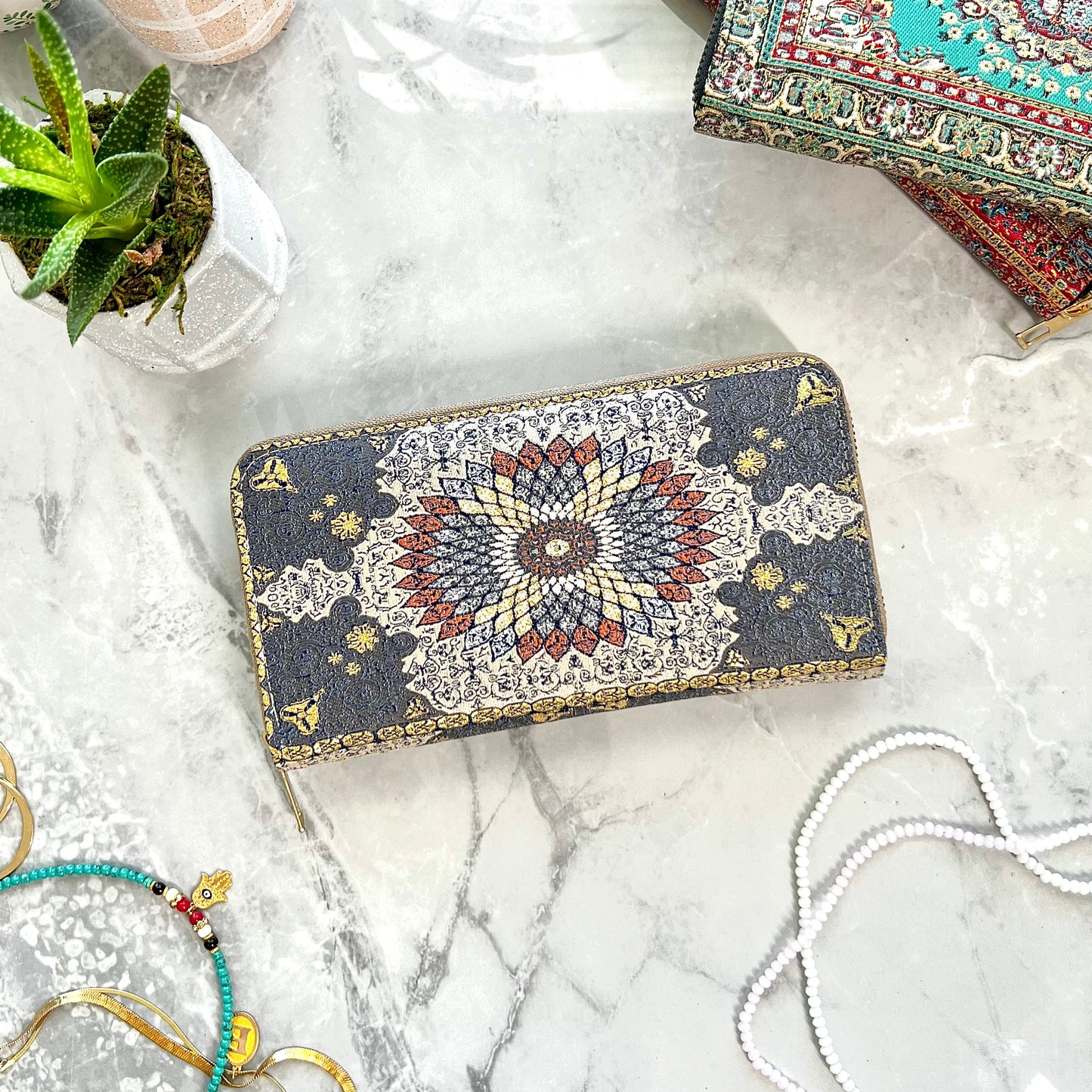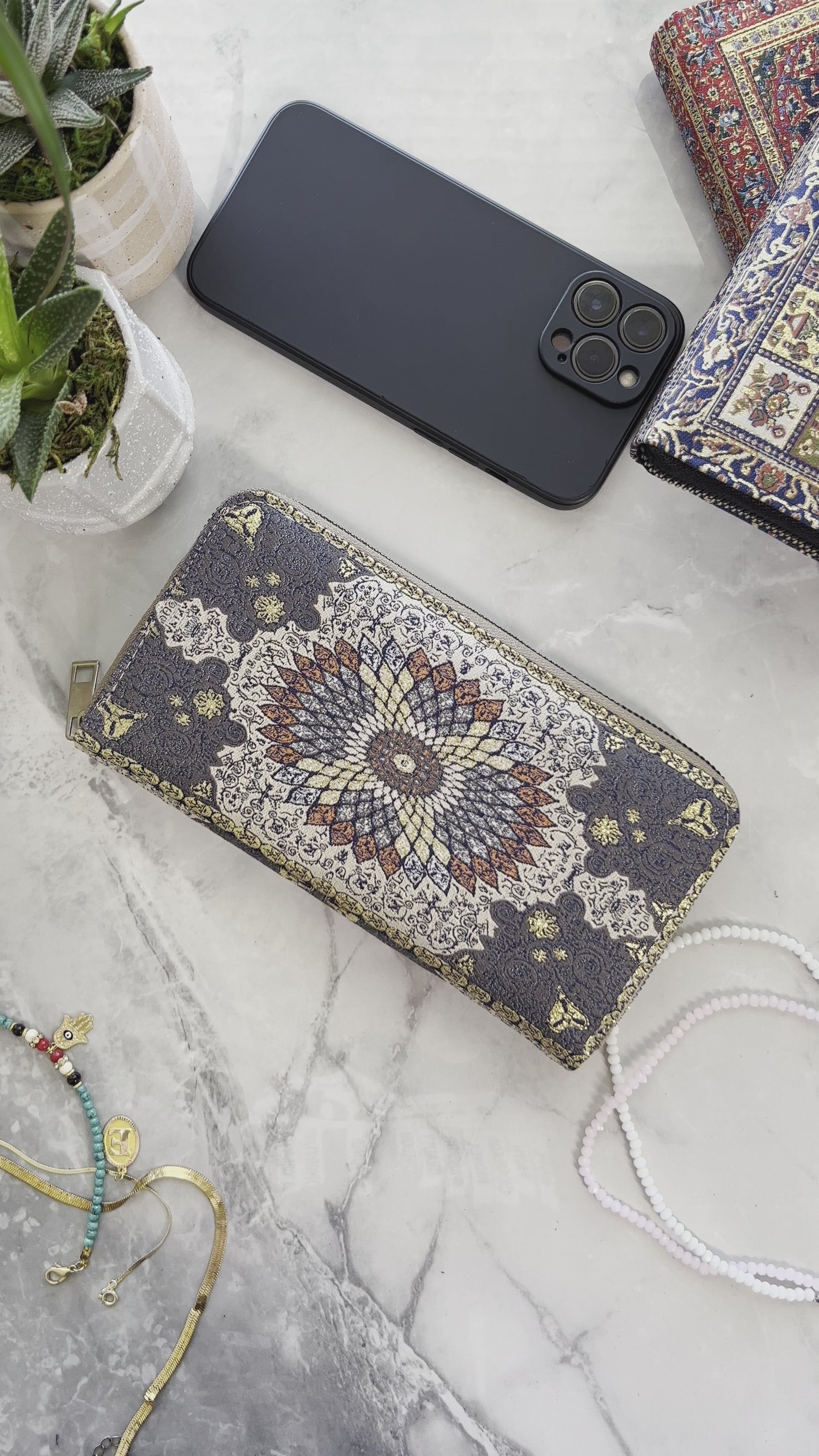 This slim wallet is made of Turkish carpet patterned brocade fabric and vegan leather. This cute wallet can keep 12 cards. It has a zipper pocket for coins and It can also fit a cell phone.